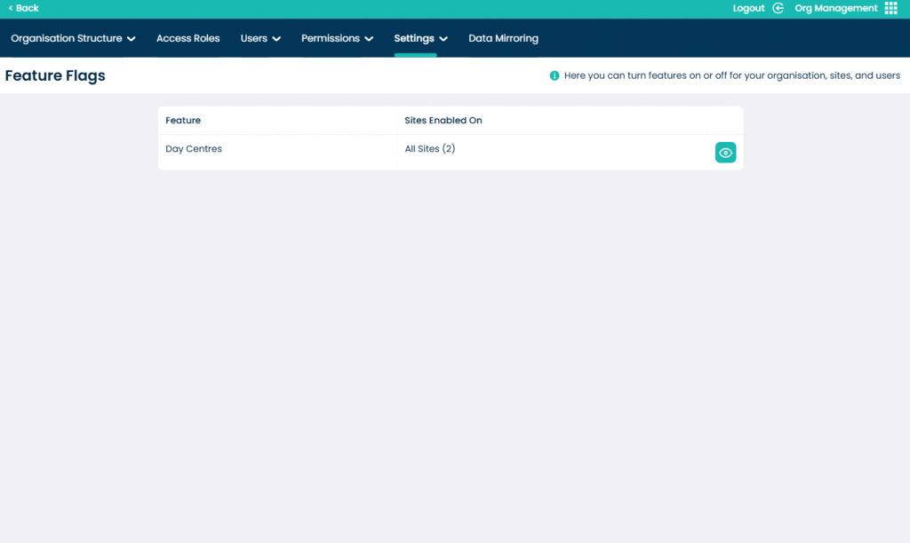 The new Feature Flags tool lets you manage access to the Day Centre feature in Cloud with ease. You can control visibility across specific sites or individual user accounts, making sure only the right people can view or manage Day Centre functions.