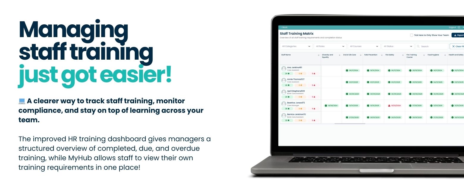 To make training management clearer and easier, we are introducing an improved HR training dashboard within Care Control Cloud, alongside enhanced visibility of training through MyHub.