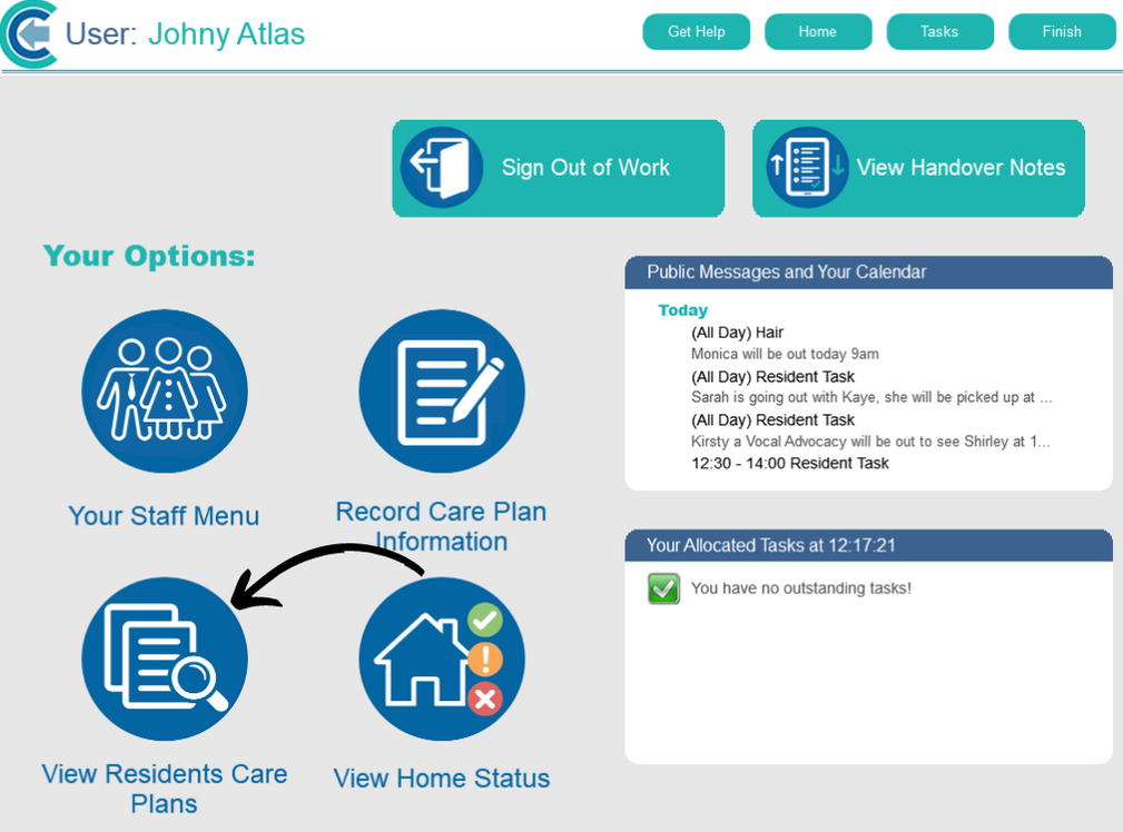 After logging into Care Control Mobile, select View Service User Care Plan from the main options.