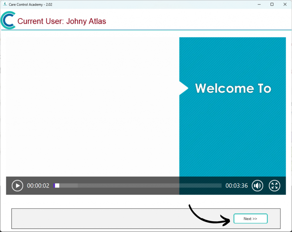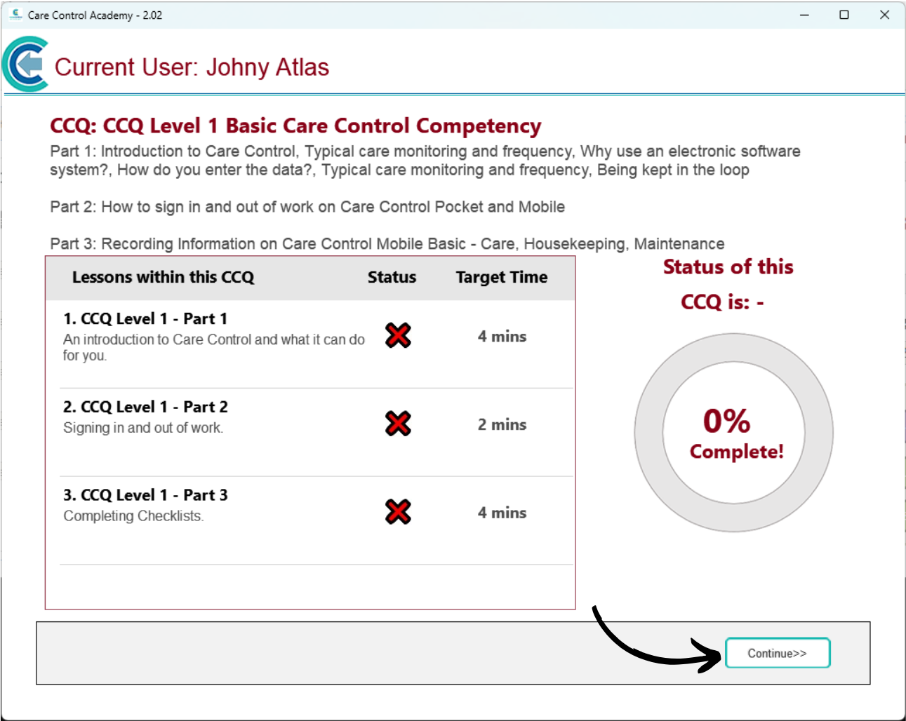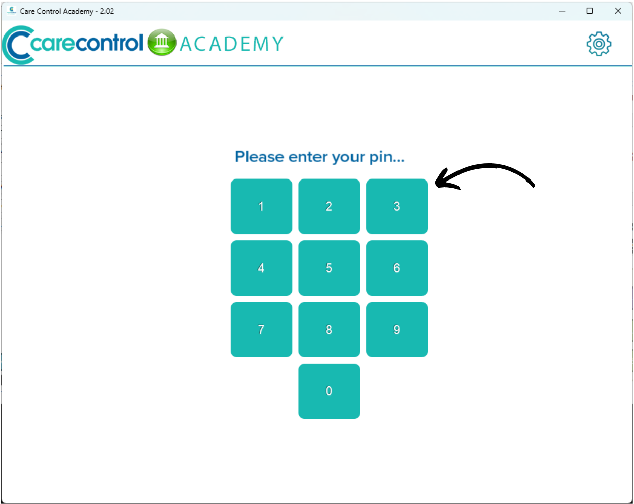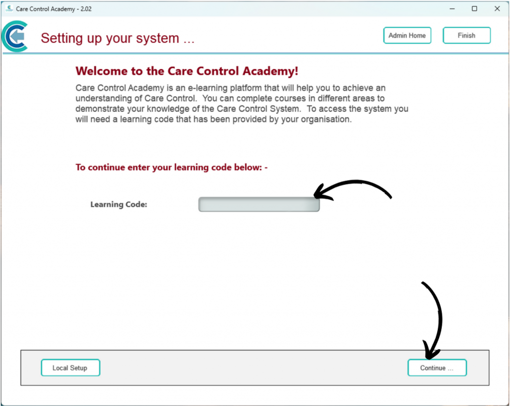 After launching the Care Control Academy application, enter your Learning Code and press Continue.