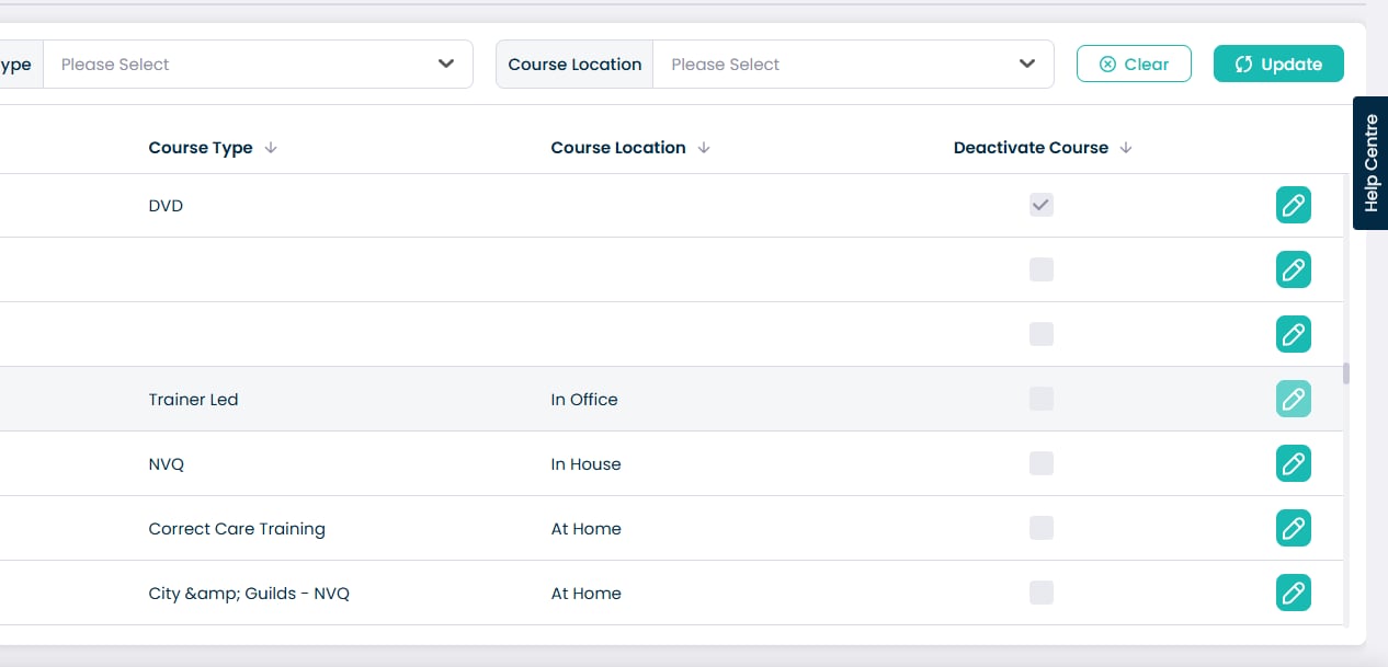 11. Your new course will appear in the list. You can edit and deactivate the course by pressing the pencil icon on the right hand side of the page.