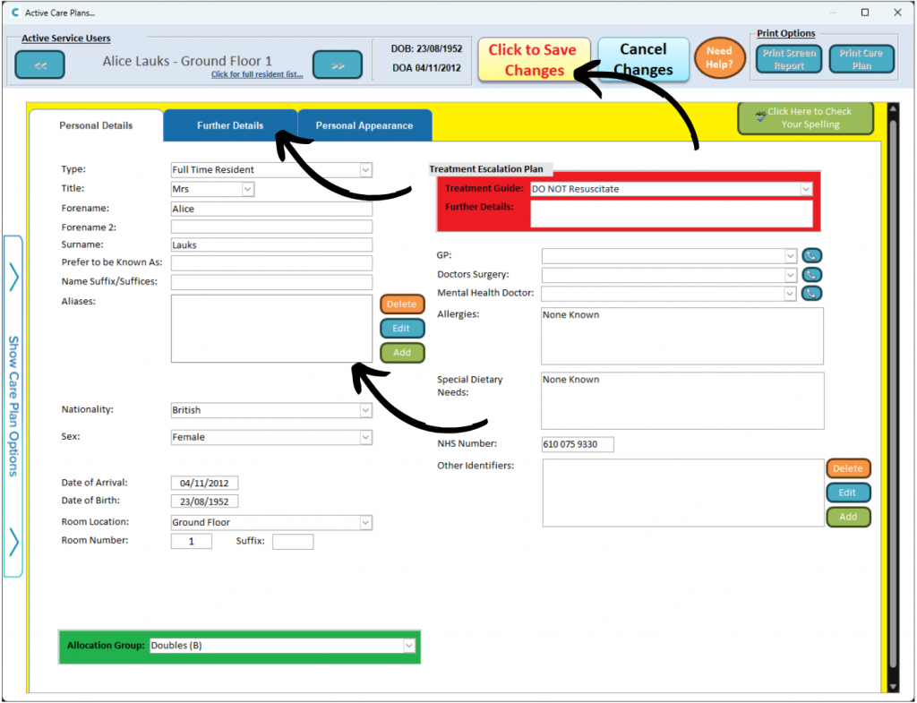 You can add, remove and edit the information here. This part of the care plan contains some crucial and important information for the service users, including things like GP & Doctors SurgeryAllergiesDNR options and much more.