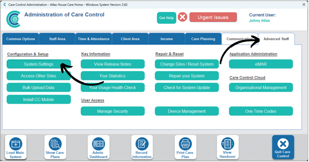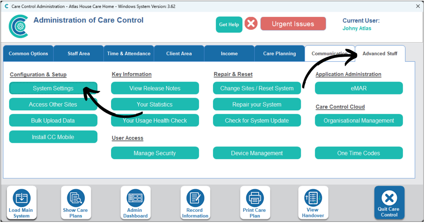 To create custom fields for information within the Personal Details area of the Care Plan, begin by opening the System Settings, which can be found under the Advanced Stuff tab.