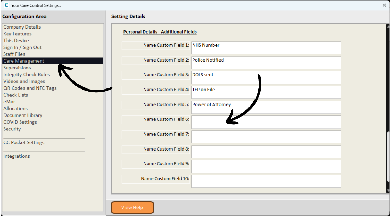 A new window will open. Here, select Care Management from the options on the left hand side. Then, scroll down to the section labelled Personal Details – Additional Fields.