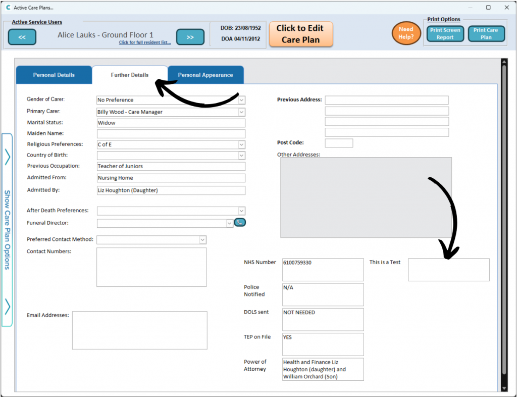 As you can see, now in the Further Details tab of the Personal Details page on the Care Plan, there is a new text entry field, labelled ‘This is a Test’.