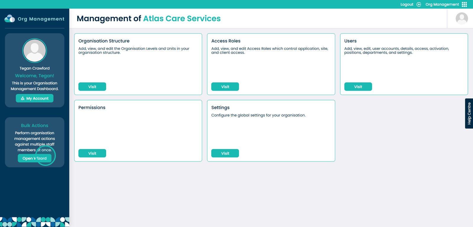 1. For this guide, you will be shown a few examples of choosing an action within the ‘Bulk Actions’ tool. To get started, In the ‘My Hub’ dashboard, click the ‘Org Management’ app.