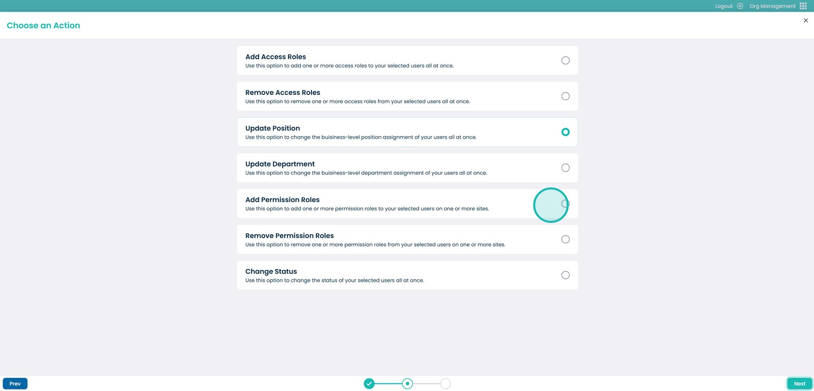21. As you’ll see, this action works slightly differently. That’s because it requires you to select both a permission role and a site before proceeding.