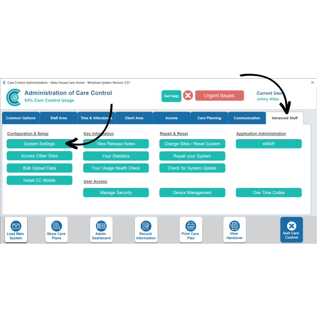 In the Administration of Care Control Windows, navigate to the System Settings, which can be found under the Advanced Stuff tab.