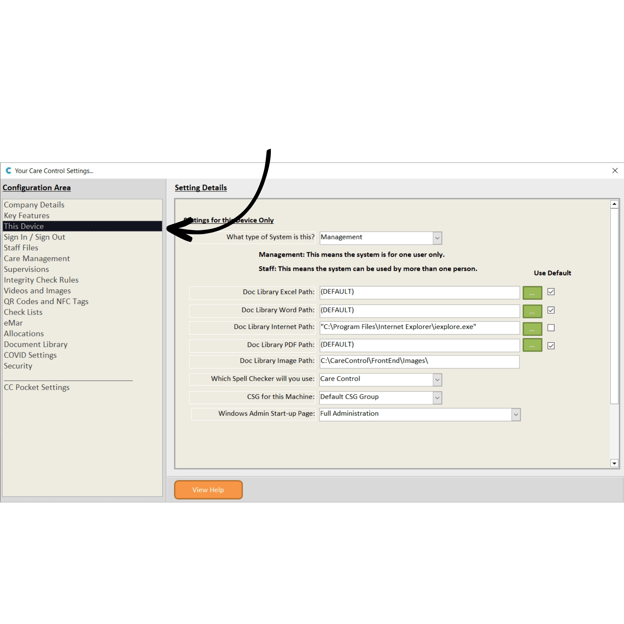Here, select This Device from the menu on the left-hand side of the window. The top setting, labelled ‘What type of system is this?’ decides on whether CC Windows starts in staff or admin mode.