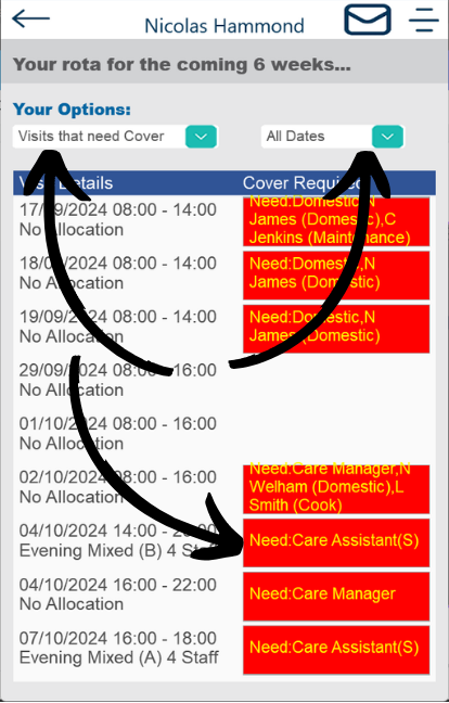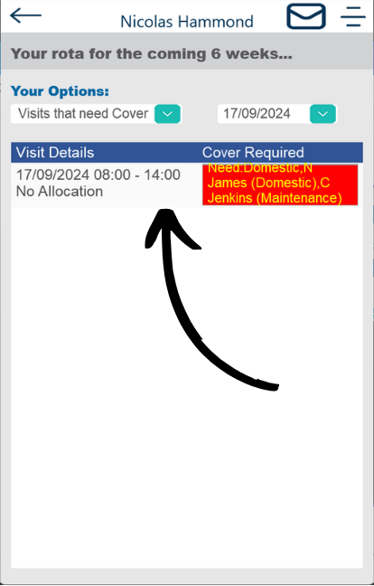 Under the Your Options header you can filter by Visits that need cover, Visits I am assigned and Show All.