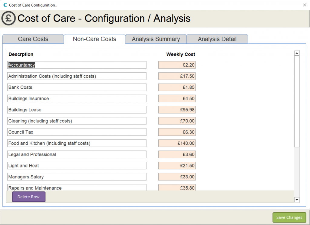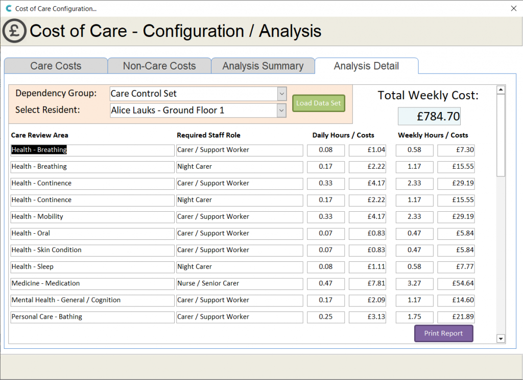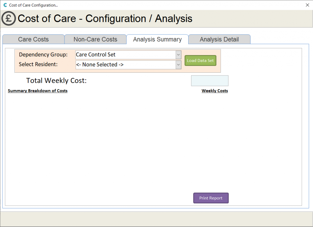 The ‘Cost of Care – Configuration / Analysis’ window will open. Here, you can view care costs, non-care costs, analysis summary and detail.