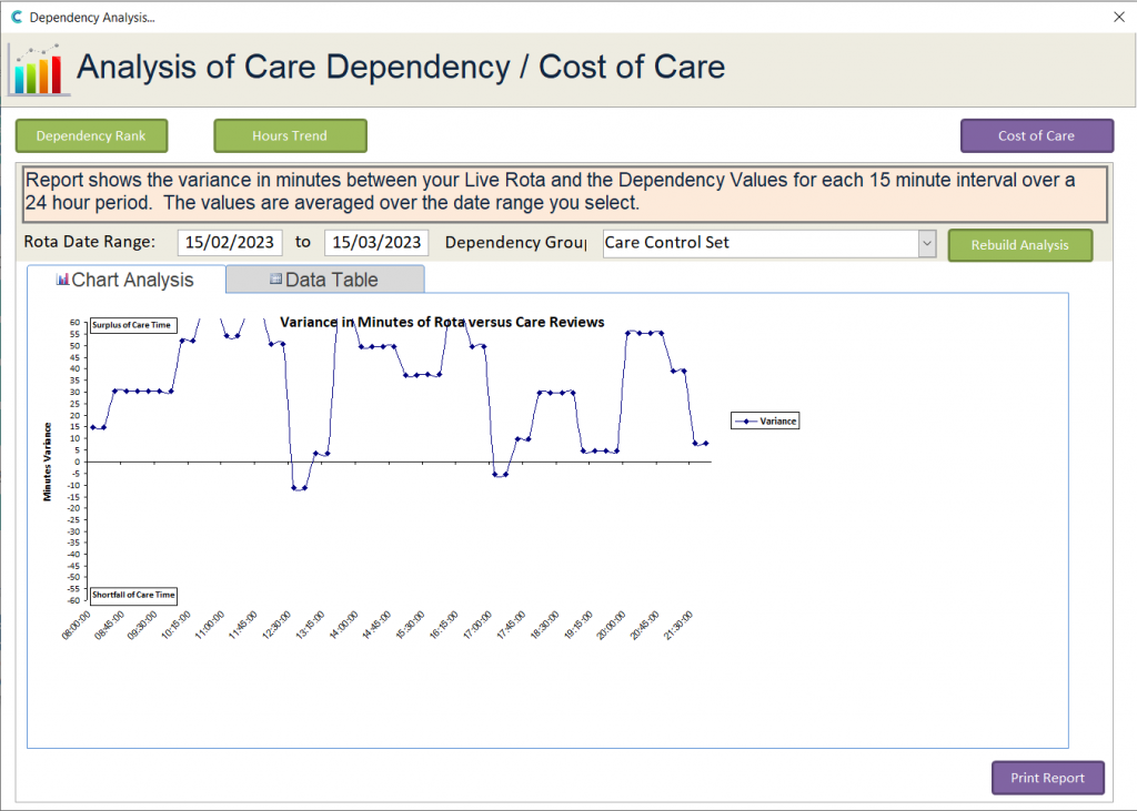 The Hours Trend analysis will open. This report shows the variance in minutes between your Live Rota and the Dependency Values for each 15-minute interval over a 24-hour period. The values are averaged over the date range selected.