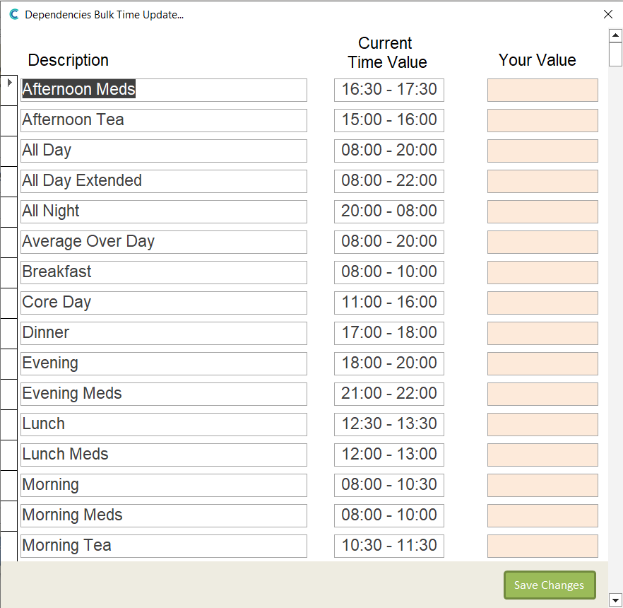 Here, you can see the times you have set and enter your own values in the Your Values column. Make sure to Save Changes after making any amendments.
