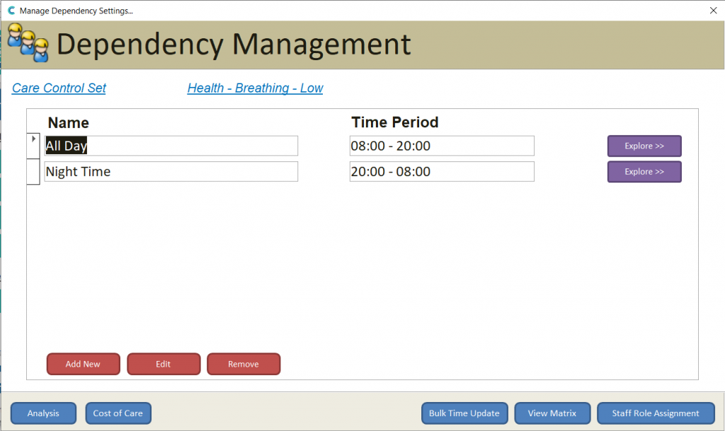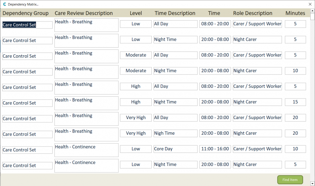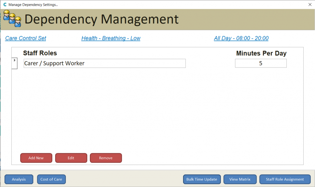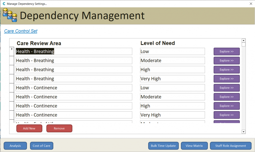 The Dependency Management window will open – this is the homepage for this feature. A list of Dependency Groups will be displayed. The Care Control Set is the default dataset, based on a time and motion study at several care homes to generate cost of care default values. This is then applied to the data produced on your system to generate cost of care and dependency for your organisation.