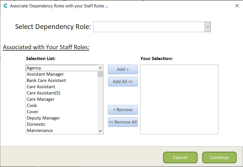 Here, you can assign a role to the area of dependency by selecting the Dependency Role from the drop-down list, then selecting the Staff Role you wish to assign.