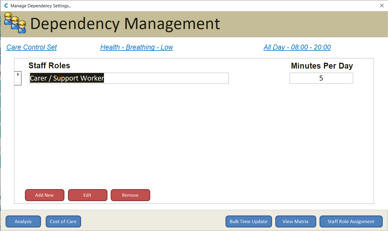 The role and time can be amended via the Edit button if you feel the associated role or time should be different. For example, medication would be a nurse or senior carer as opposed to a care assistant.