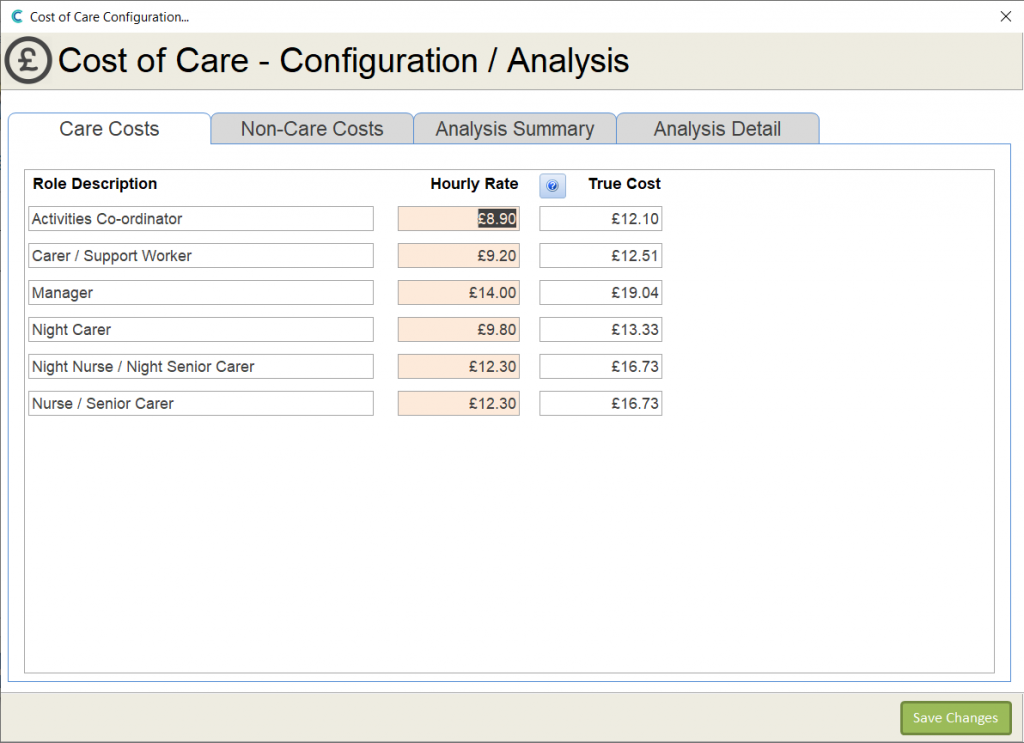 The first tab, Care Costs, is the cost of your staff per hour. You will need to enter values for hourly rate for each role. The True Cost will be automatically generated based on the hourly rate. Press the ‘?’ icon to read more about true costs.