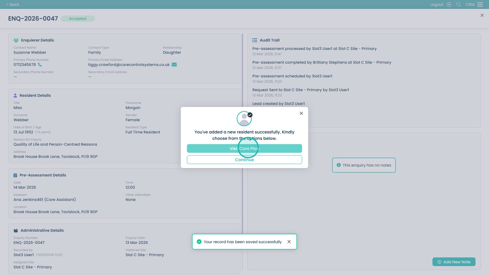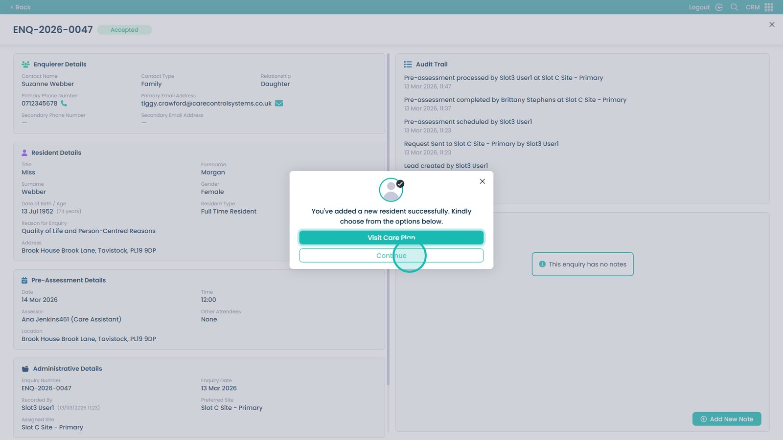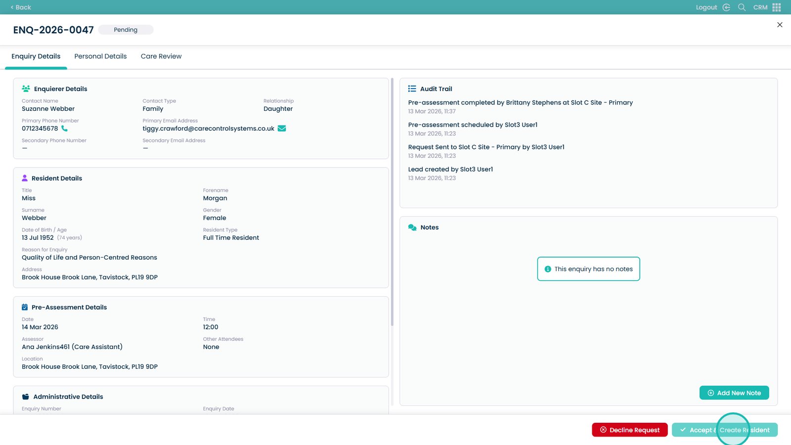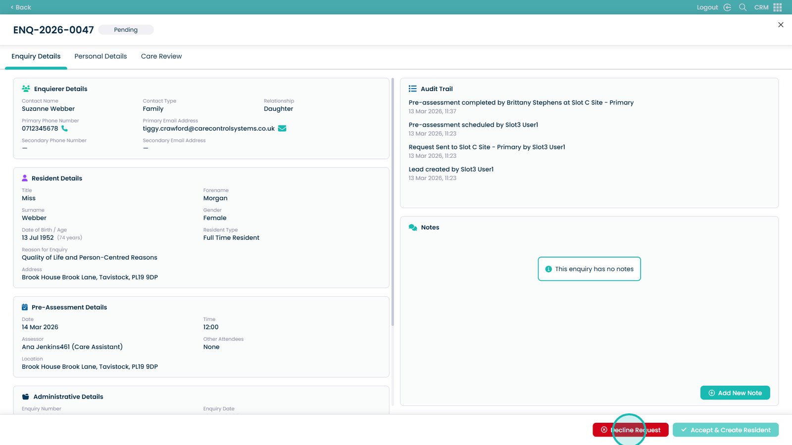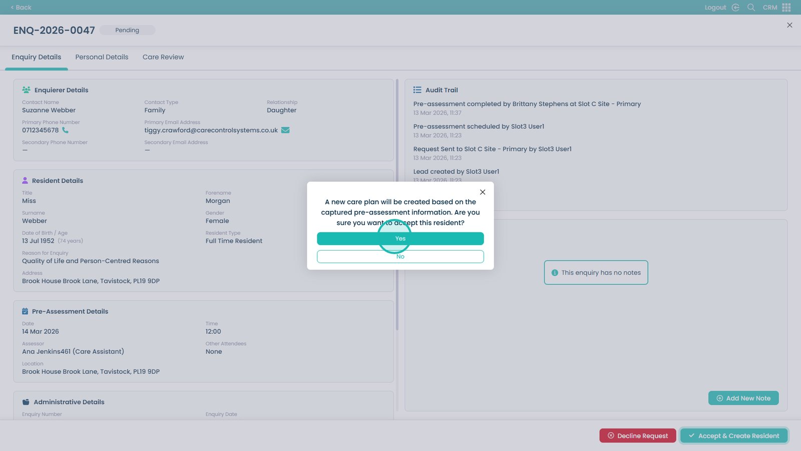 If accepted, you can create a new care plan directly from the pre-assessment information, allowing a smooth transition into care planning. If declined, you will be prompted to record a reason and any additional notes to ensure accurate documentation.