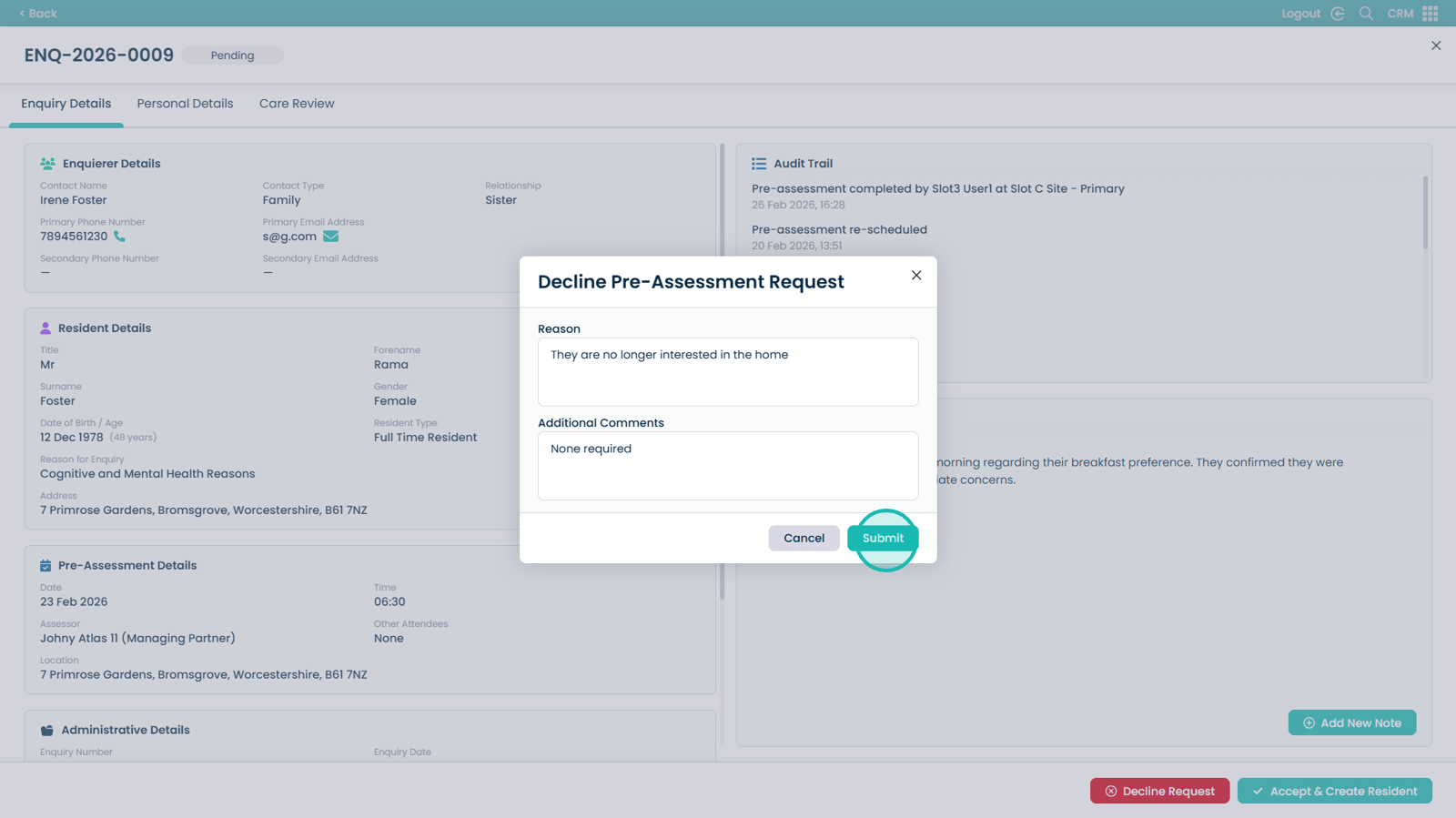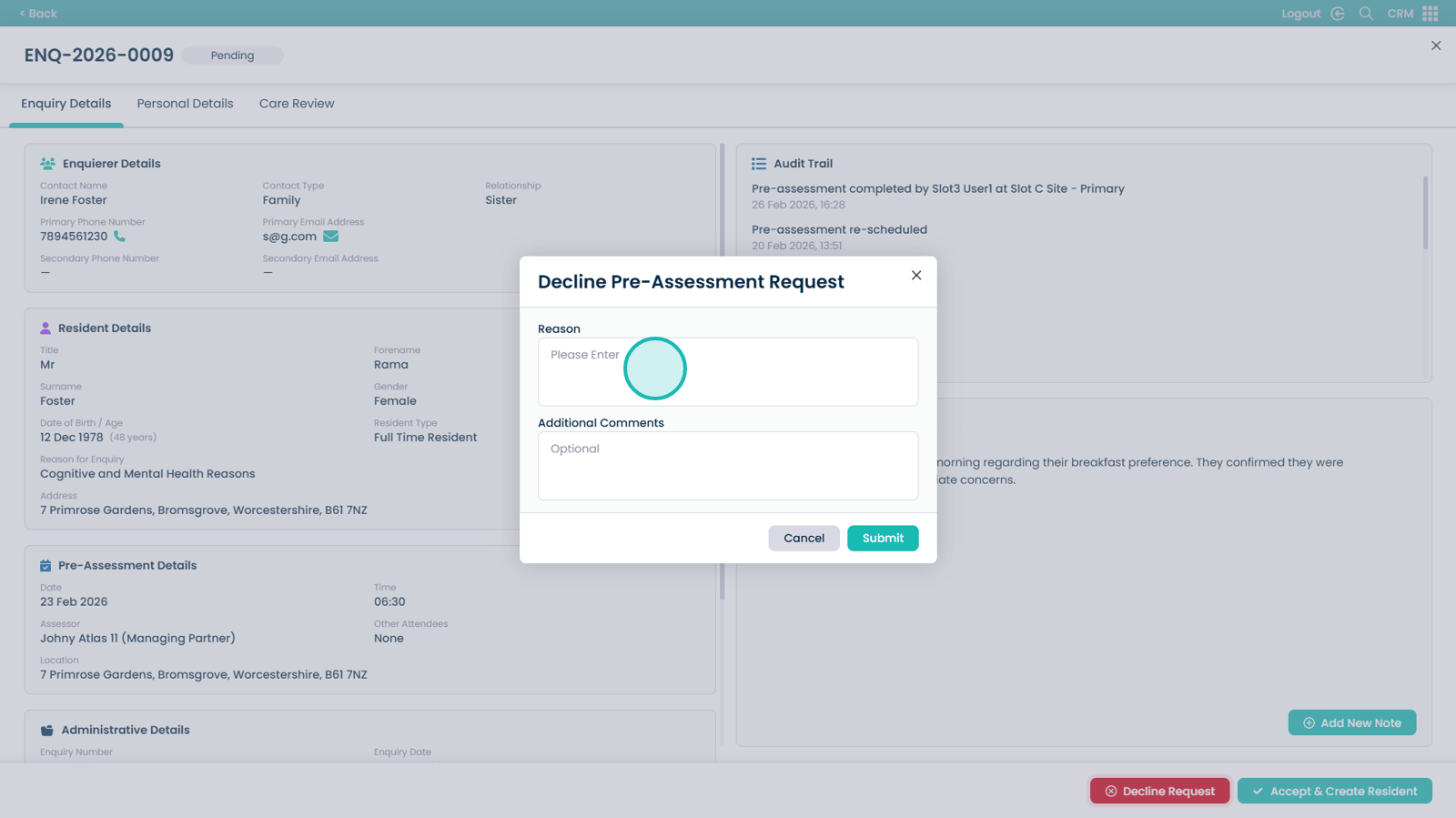 If accepted, you can create a new care plan directly from the pre-assessment information, allowing a smooth transition into care planning. If declined, you will be prompted to record a reason and any additional notes to ensure accurate documentation.