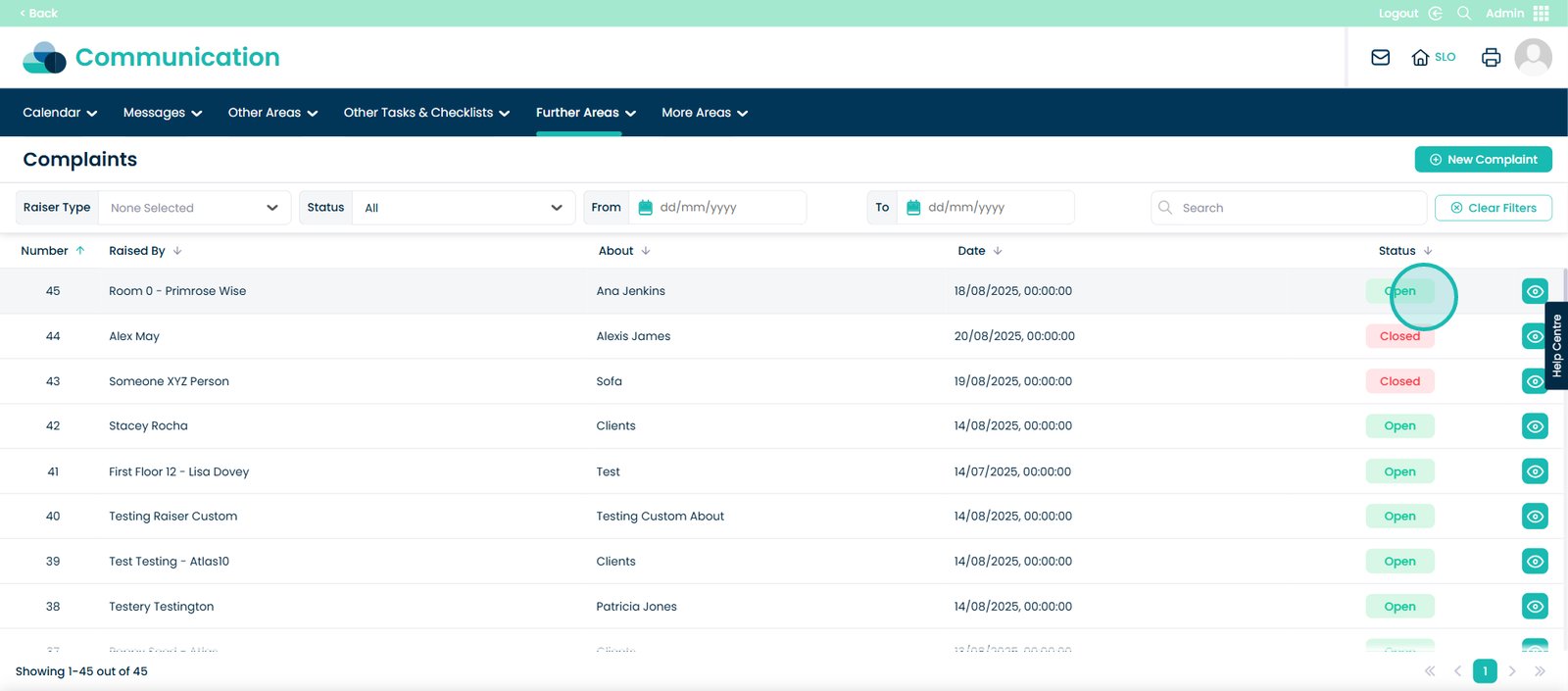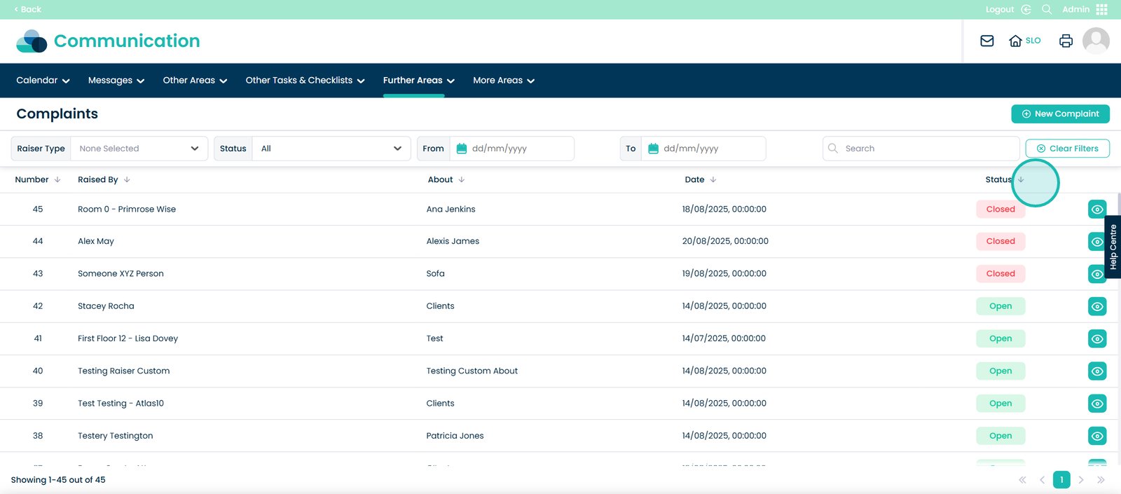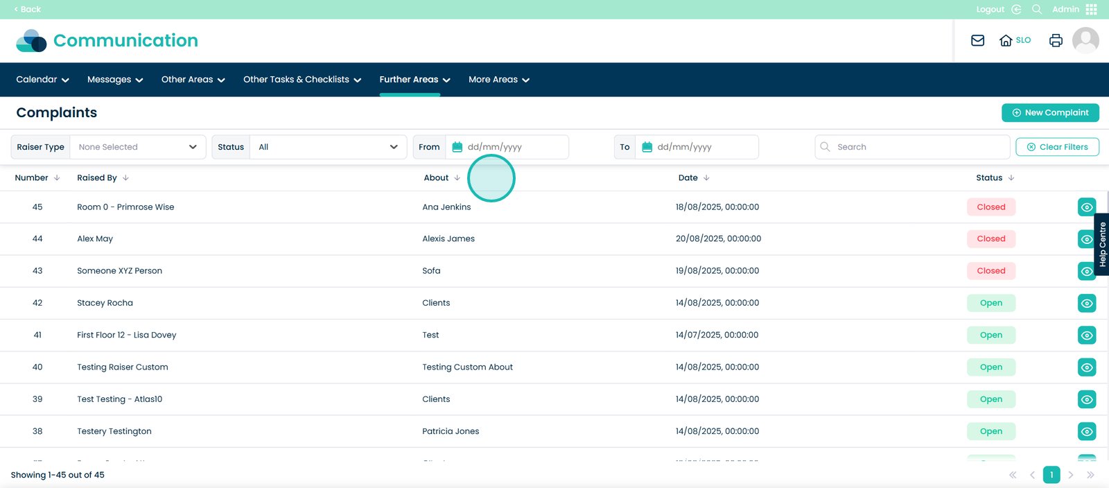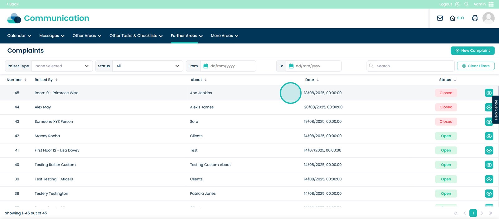 Here you will see the Complaints screen. Since this screen is already populated with complaints, you should expect to see a similar layout within your system once adding complaints.