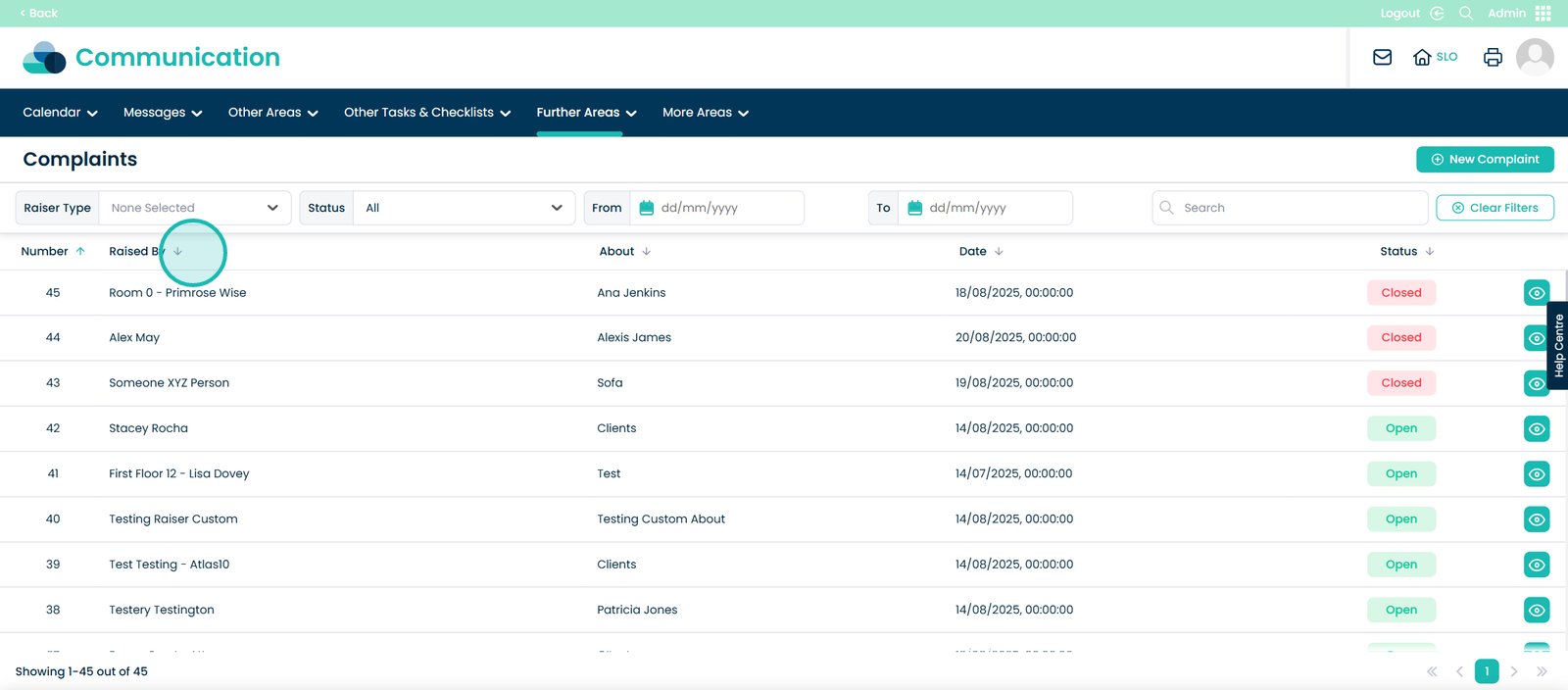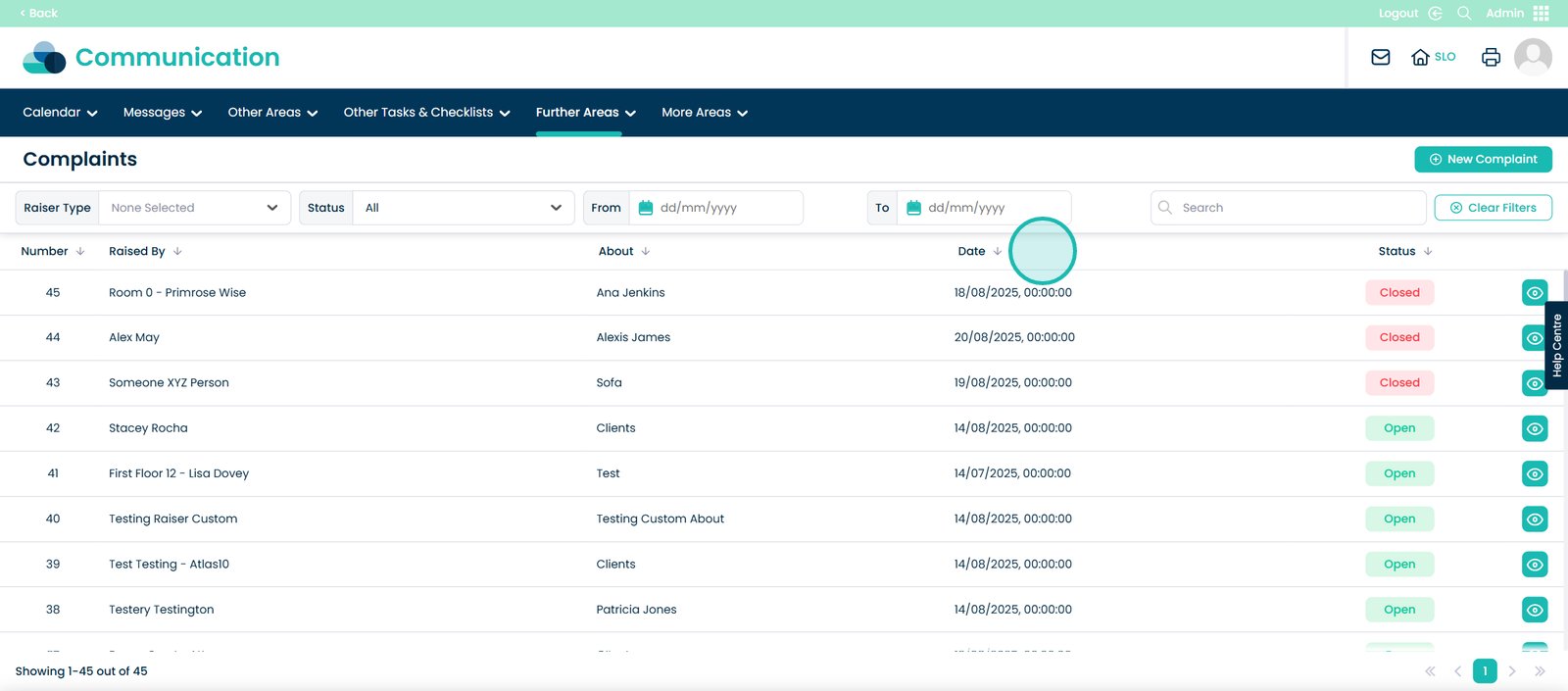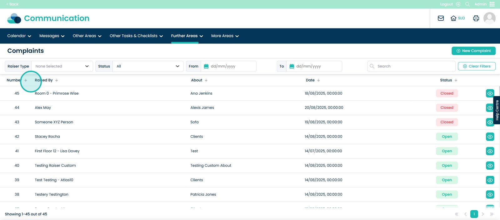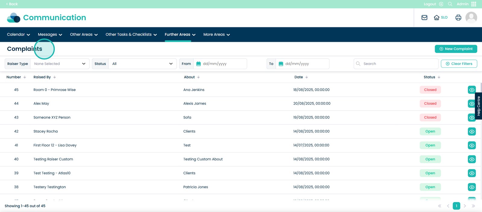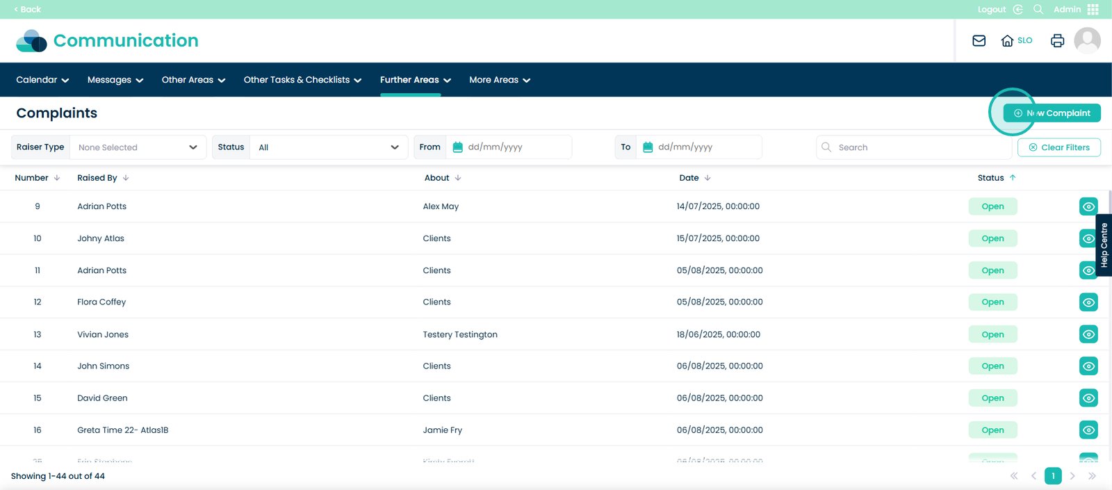Here you will see the Complaints screen. Since this screen is already populated with complaints, you should expect to see a similar layout within your system once adding complaints.