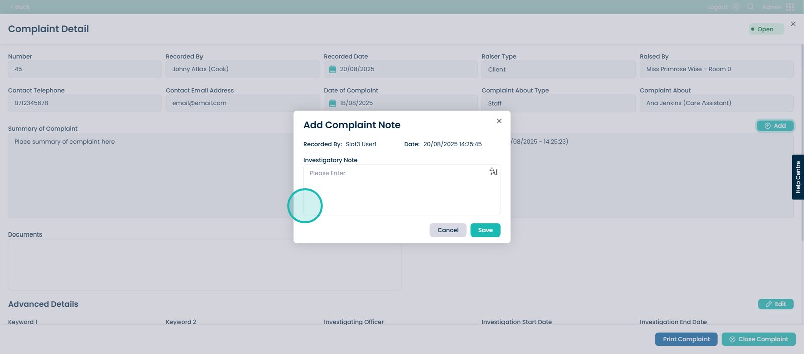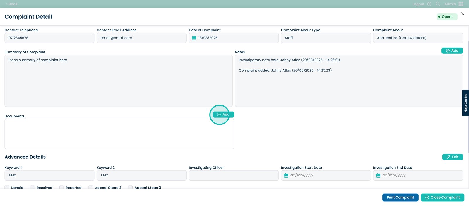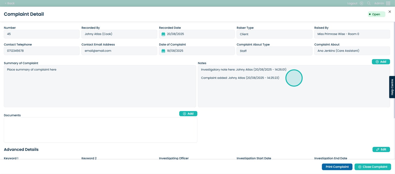 This new feature gives you a clear overview of all complaints raised within your service — whether by a service user, staff member, professional, or visitor. It helps you manage the process more effectively by allowing you to add ongoing investigatory notes, link multiple service users to a single complaint where necessary, and securely upload supporting documents with password protection to maintain confidentiality. With everything stored in one place, you can demonstrate transparency, strengthen accountability, and streamline how complaints are handled from start to finish.