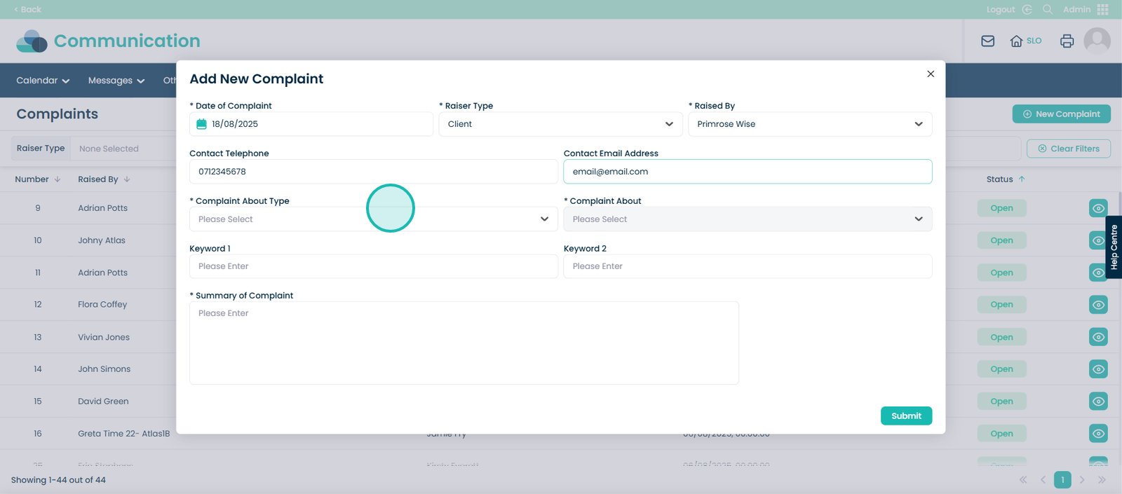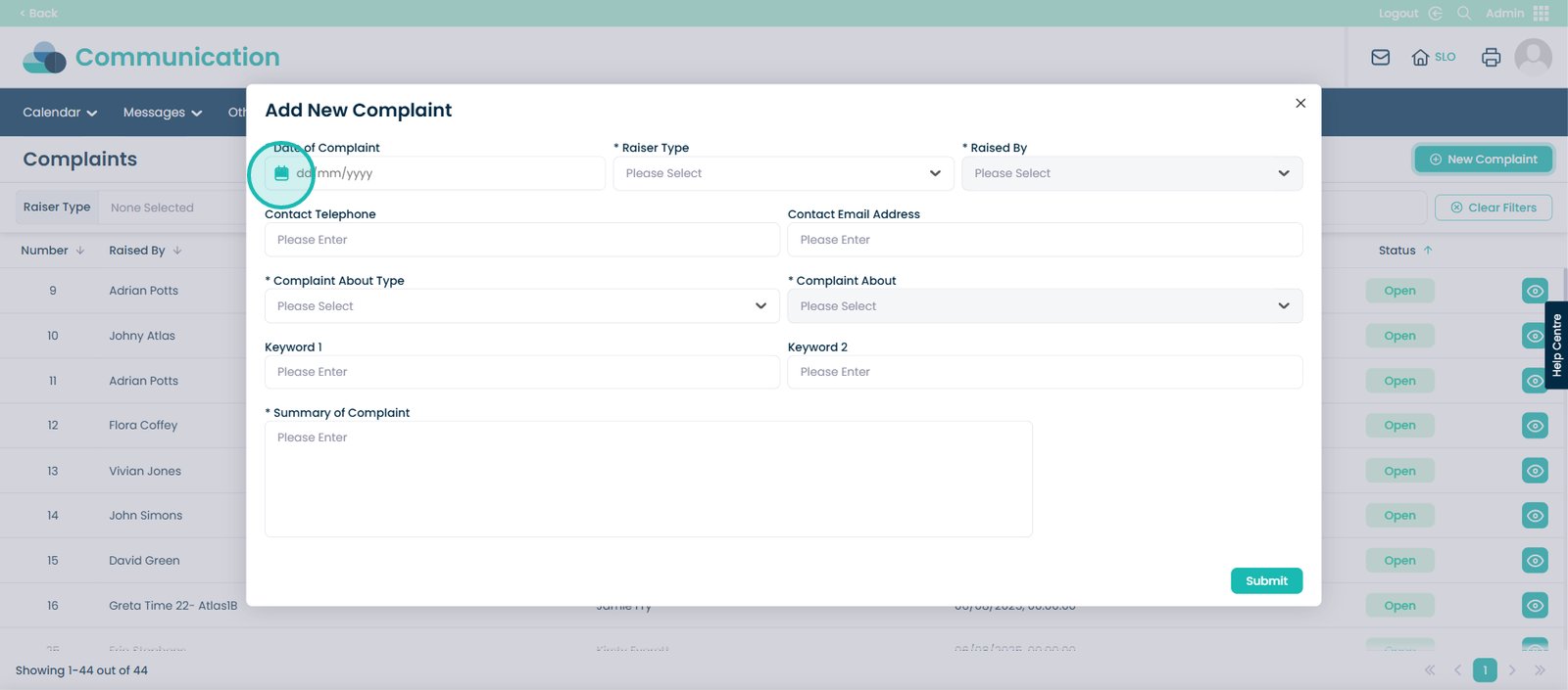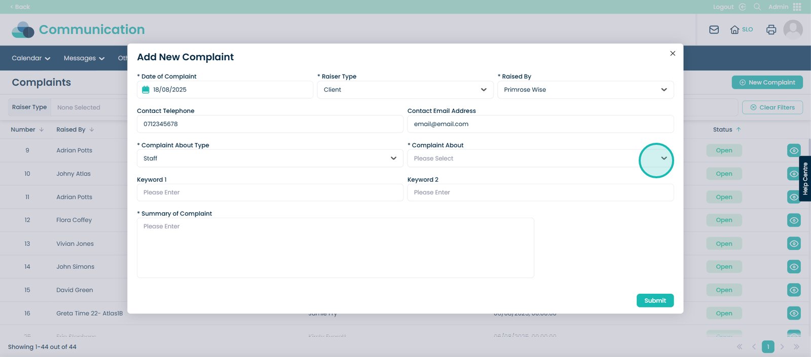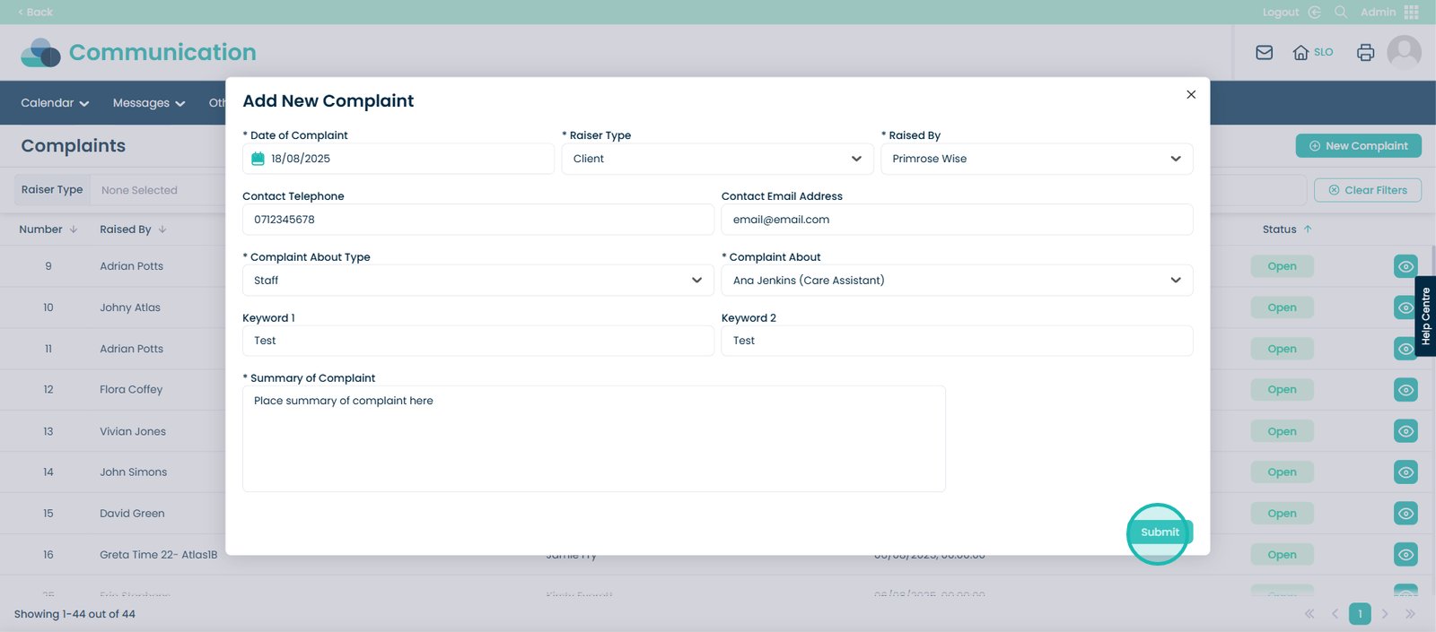 Once you have entered the details of the new complaint, select the ‘Submit’ button.