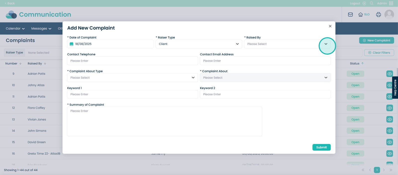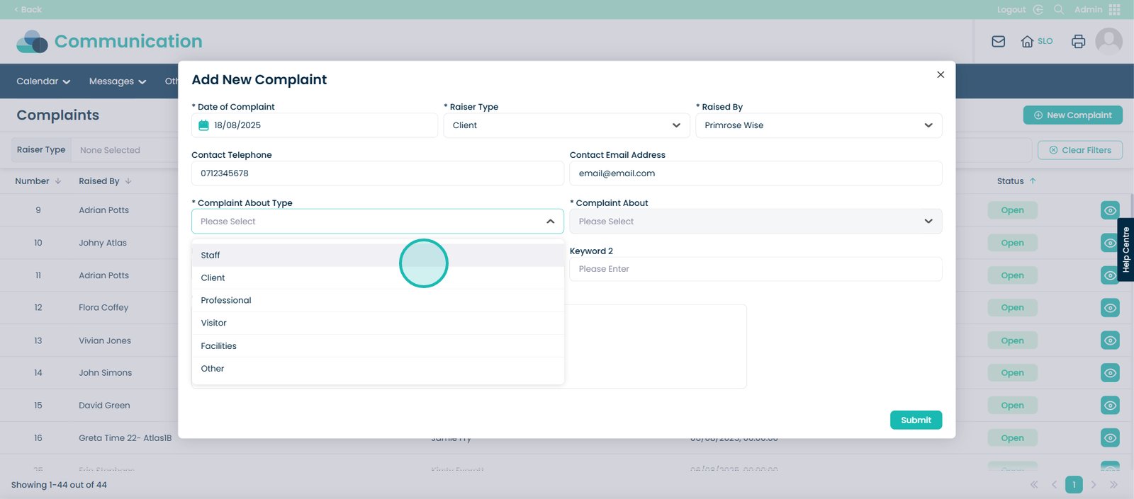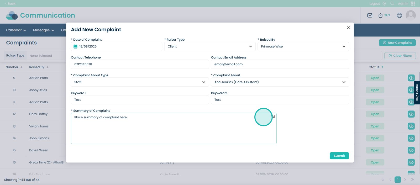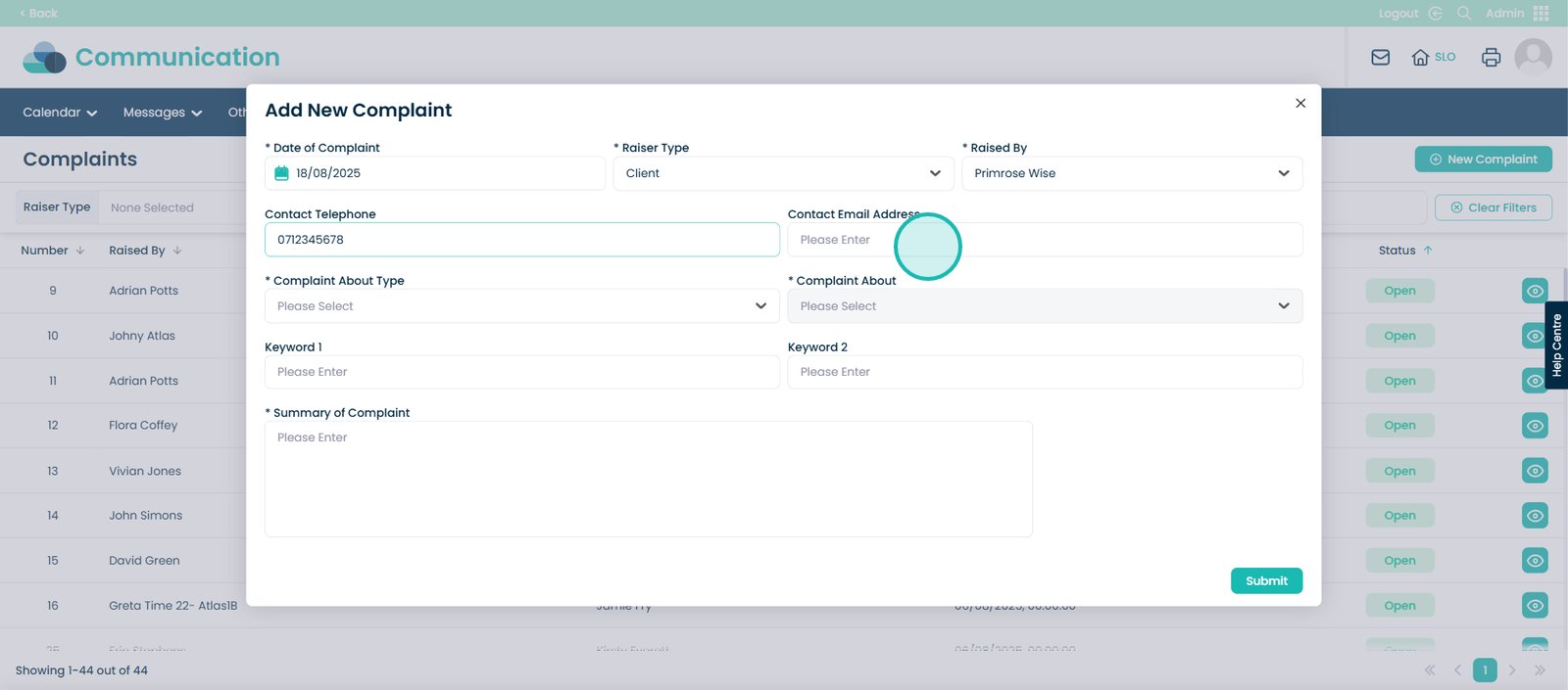 Once you have entered the details of the new complaint, select the ‘Submit’ button.