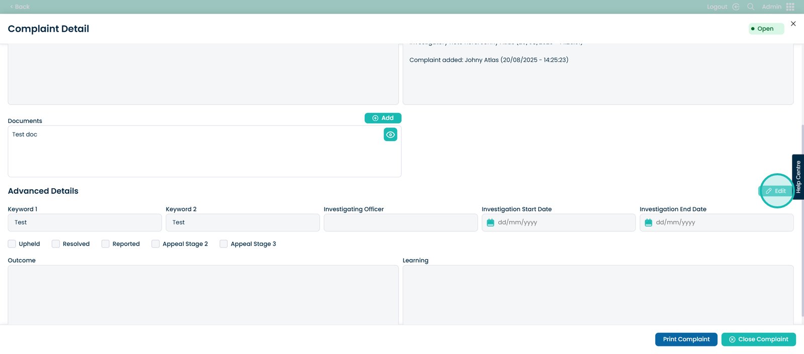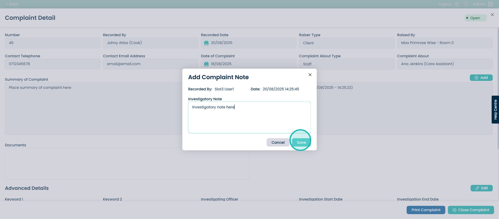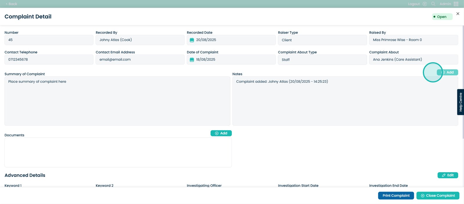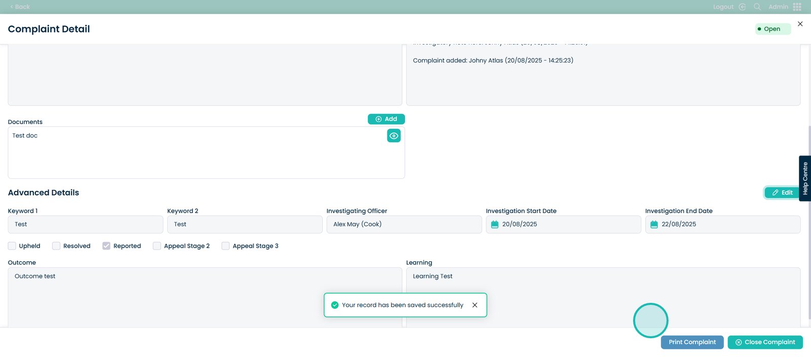 Here, you will see the complaint detail. Here you can add more notes to the complaint as the complaint investigation continues.
