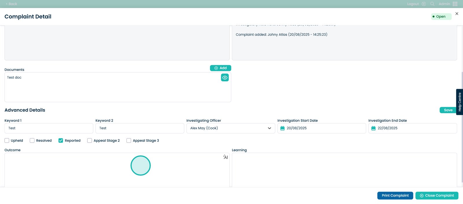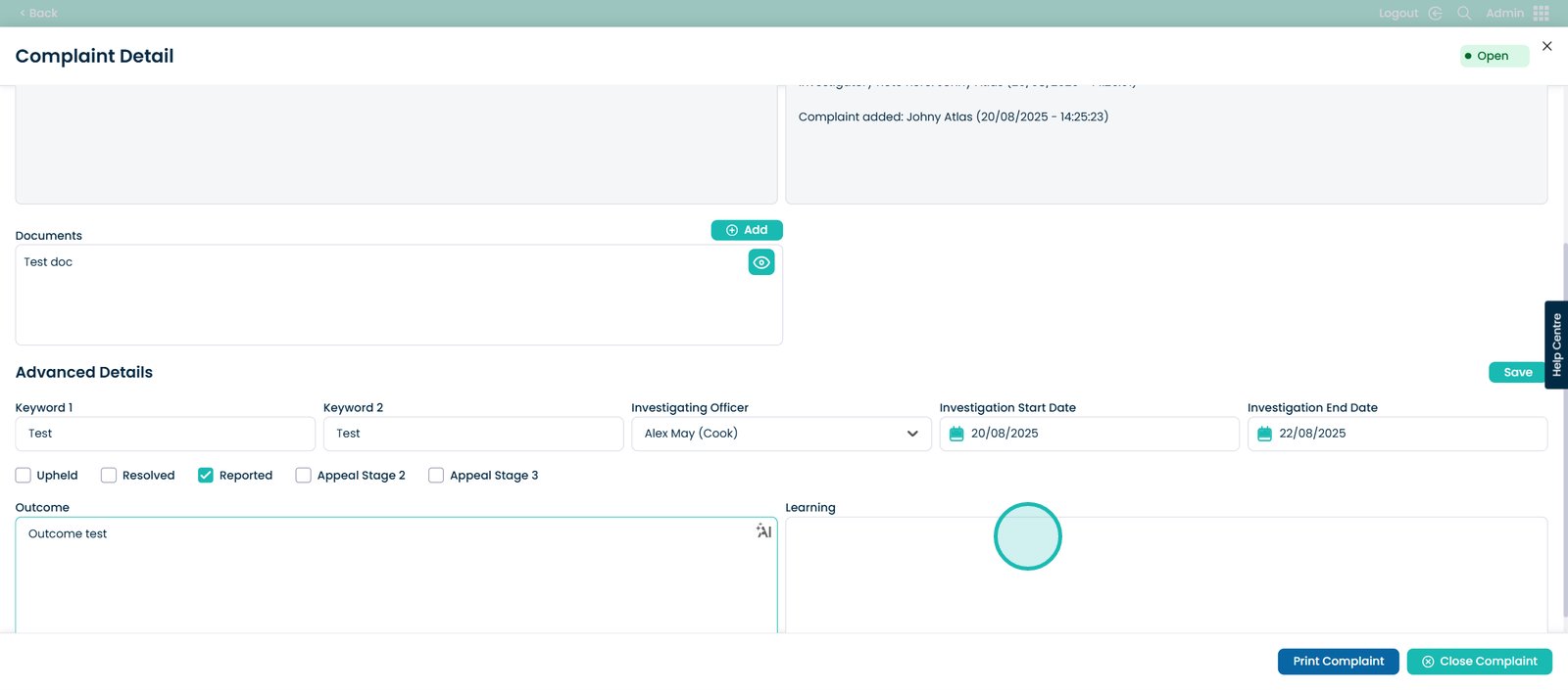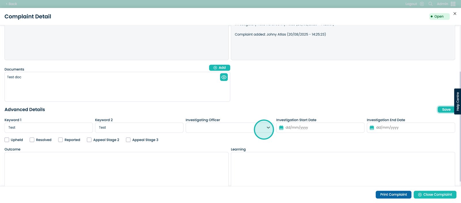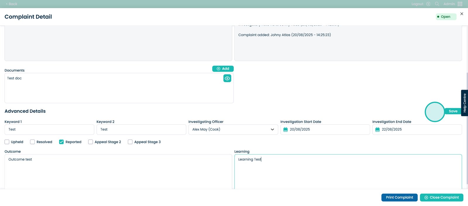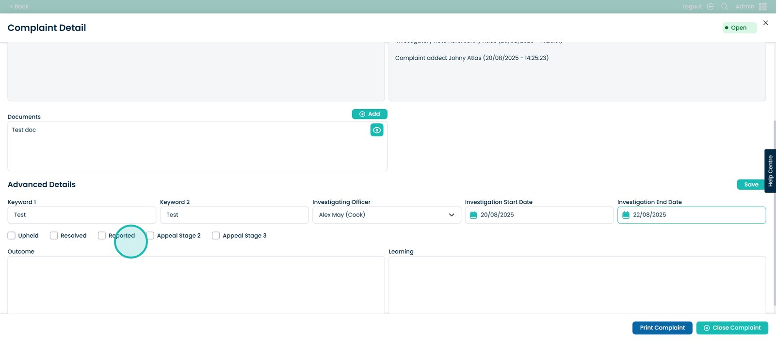 Now you have the option to add 2 key words to this complaint. So for example, if this complaint was in relation to safeguarding, you would add this as a keyword.