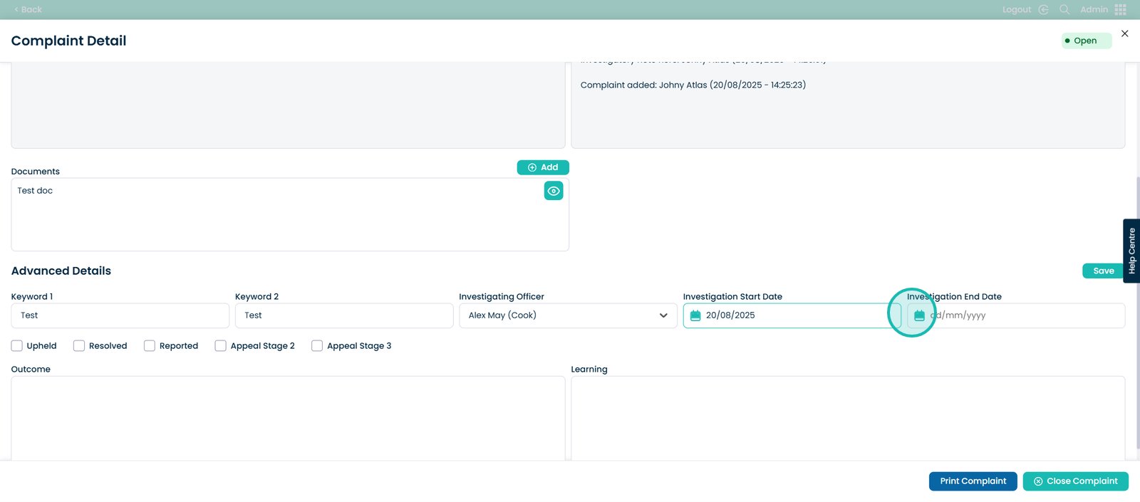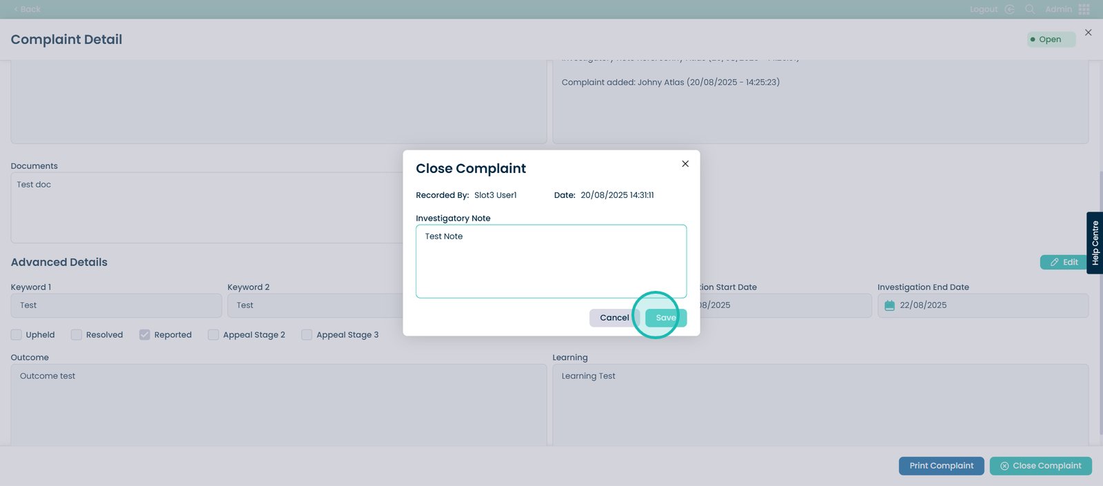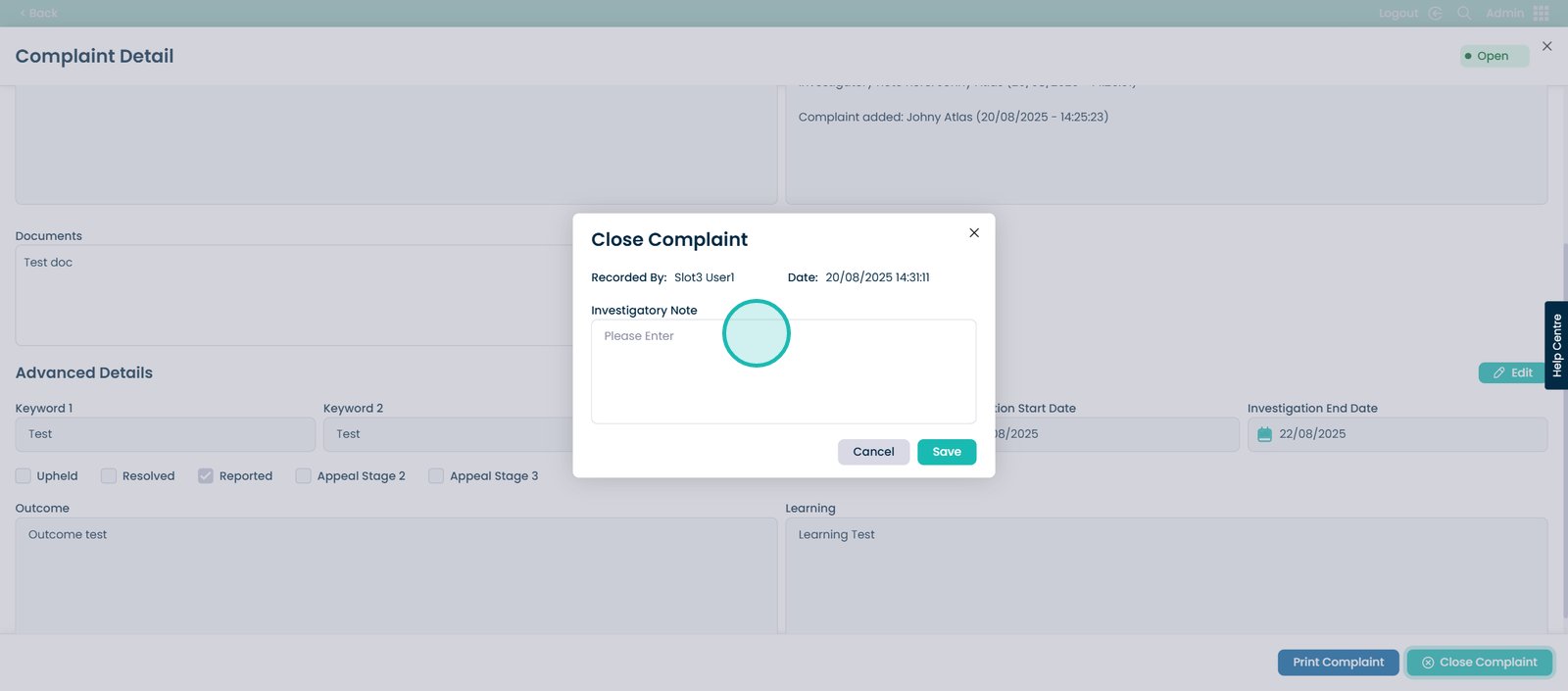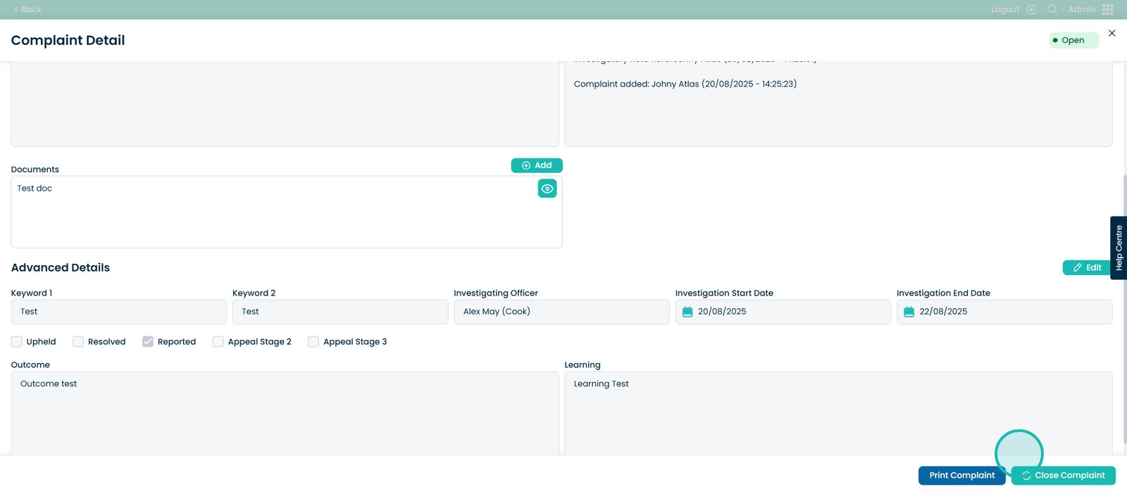 And once the compliant has come to a close and the investigation has been completed, select the ‘Close Complaint’ button.