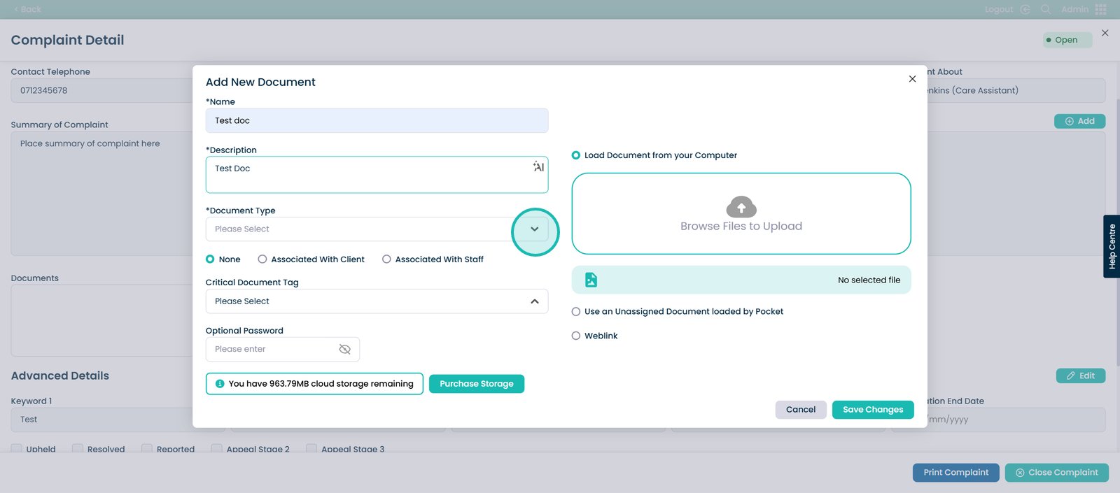 Choose from a drop-down list to choose what category the document should be within. You can create your own Document Type in Cloud.