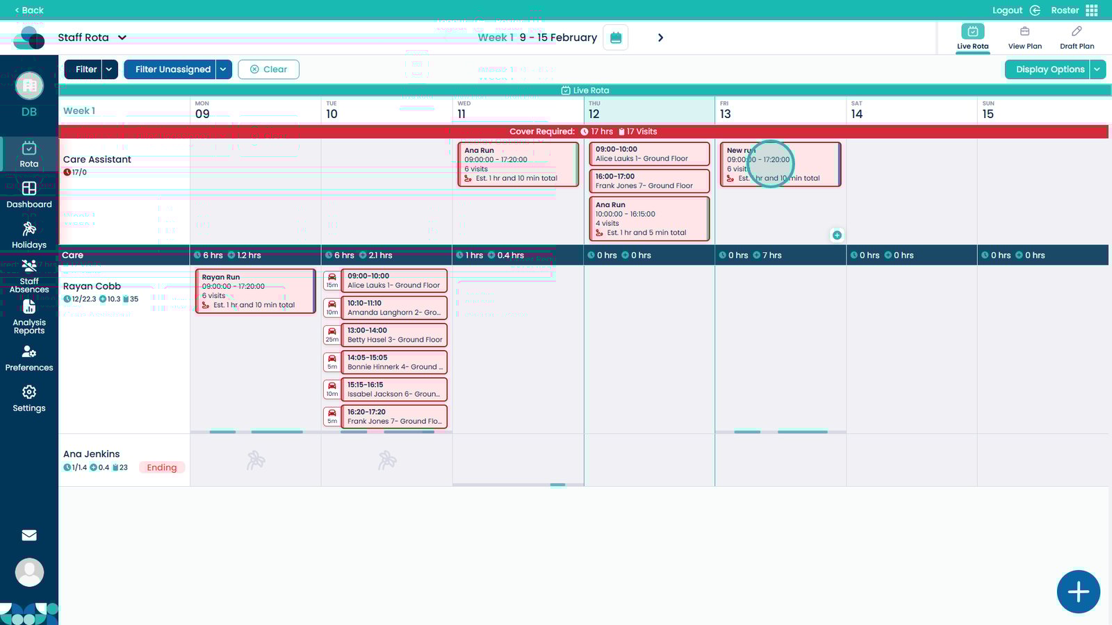 By linking a run to a staff member, you ensure that visits are clearly scheduled, availability is respected, and travel time is calculated correctly. This helps maintain an organised rota, improves visibility of workloads, and supports efficient day-to-day planning within your service.