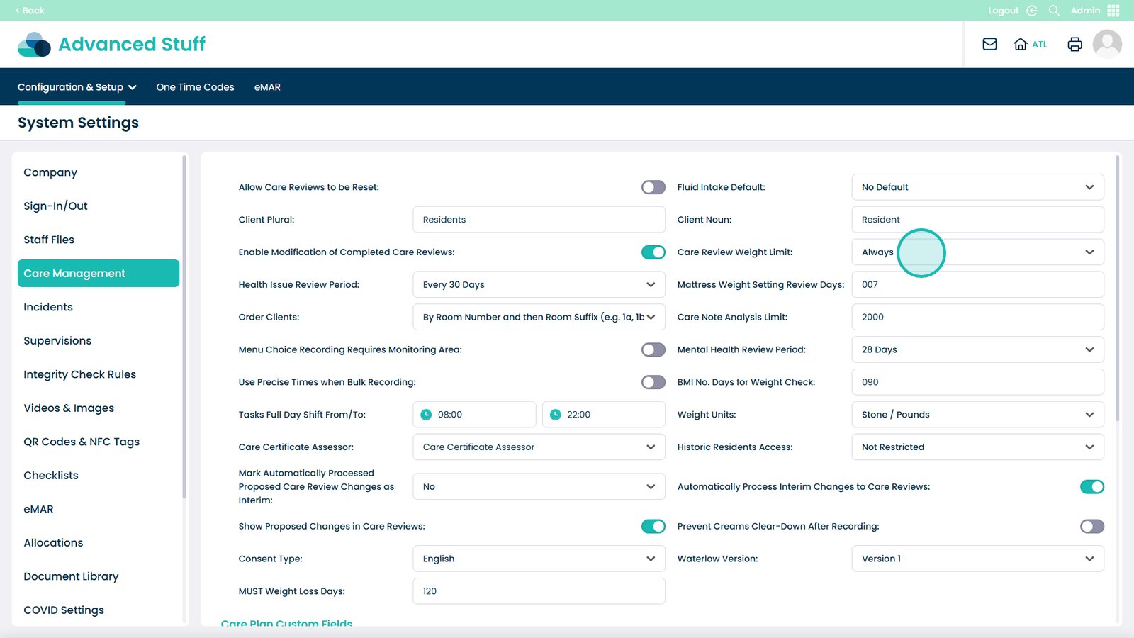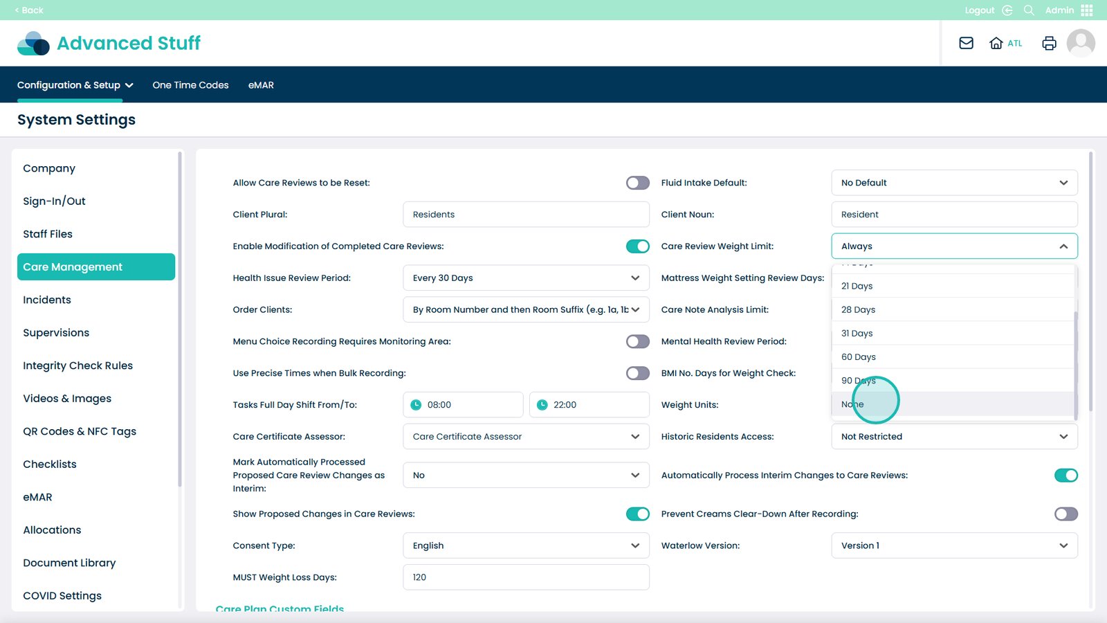 Open the drop-down under Care Review Weight Limit