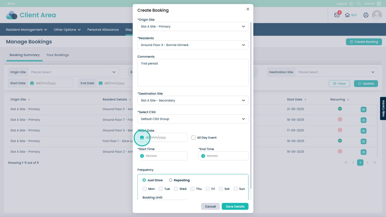 Booking day centre visits has never been easier. This feature allows you to quickly create and manage bookings for your residents, making sure everyone is where they need to be at the right time. You can select the starting and destination sites, choose the resident, set times and dates, and even make recurring bookings for regular visits. Adding notes and assigning CSGs helps keep staff informed and ensures residents receive the right care and support.