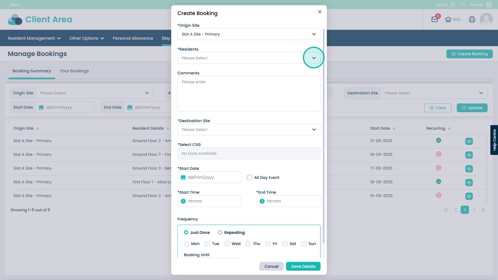 Booking day centre visits has never been easier. This feature allows you to quickly create and manage bookings for your residents, making sure everyone is where they need to be at the right time. You can select the starting and destination sites, choose the resident, set times and dates, and even make recurring bookings for regular visits. Adding notes and assigning CSGs helps keep staff informed and ensures residents receive the right care and support.