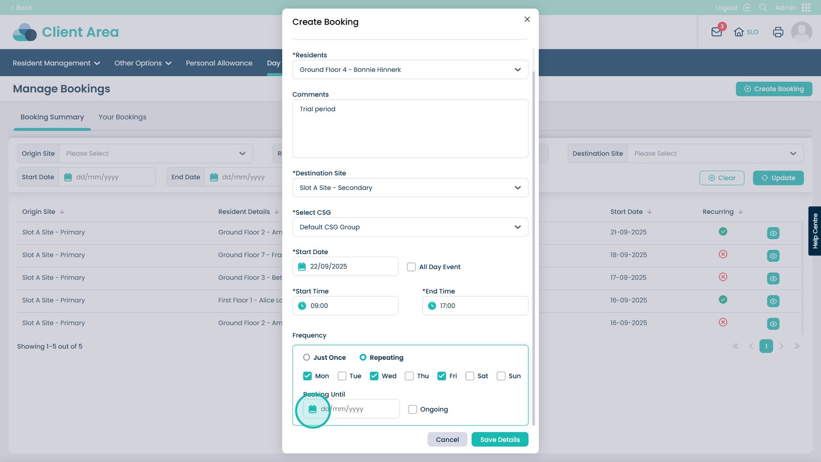 Booking day centre visits has never been easier. This feature allows you to quickly create and manage bookings for your residents, making sure everyone is where they need to be at the right time. You can select the starting and destination sites, choose the resident, set times and dates, and even make recurring bookings for regular visits. Adding notes and assigning CSGs helps keep staff informed and ensures residents receive the right care and support.