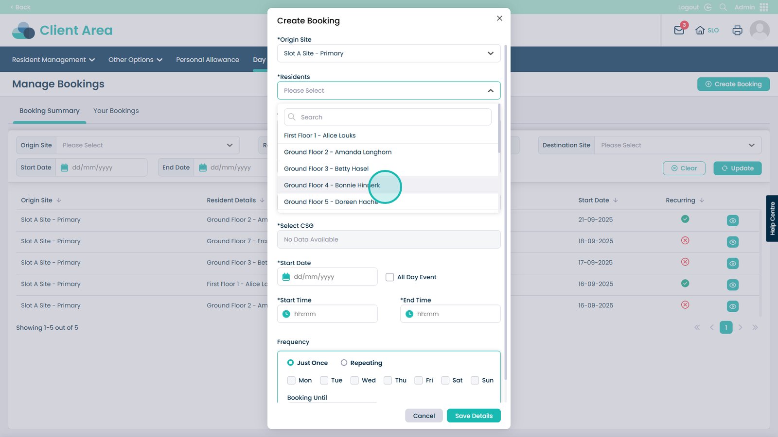 Booking day centre visits has never been easier. This feature allows you to quickly create and manage bookings for your residents, making sure everyone is where they need to be at the right time. You can select the starting and destination sites, choose the resident, set times and dates, and even make recurring bookings for regular visits. Adding notes and assigning CSGs helps keep staff informed and ensures residents receive the right care and support.