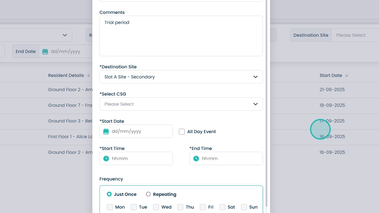 Booking day centre visits has never been easier. This feature allows you to quickly create and manage bookings for your residents, making sure everyone is where they need to be at the right time. You can select the starting and destination sites, choose the resident, set times and dates, and even make recurring bookings for regular visits. Adding notes and assigning CSGs helps keep staff informed and ensures residents receive the right care and support.
