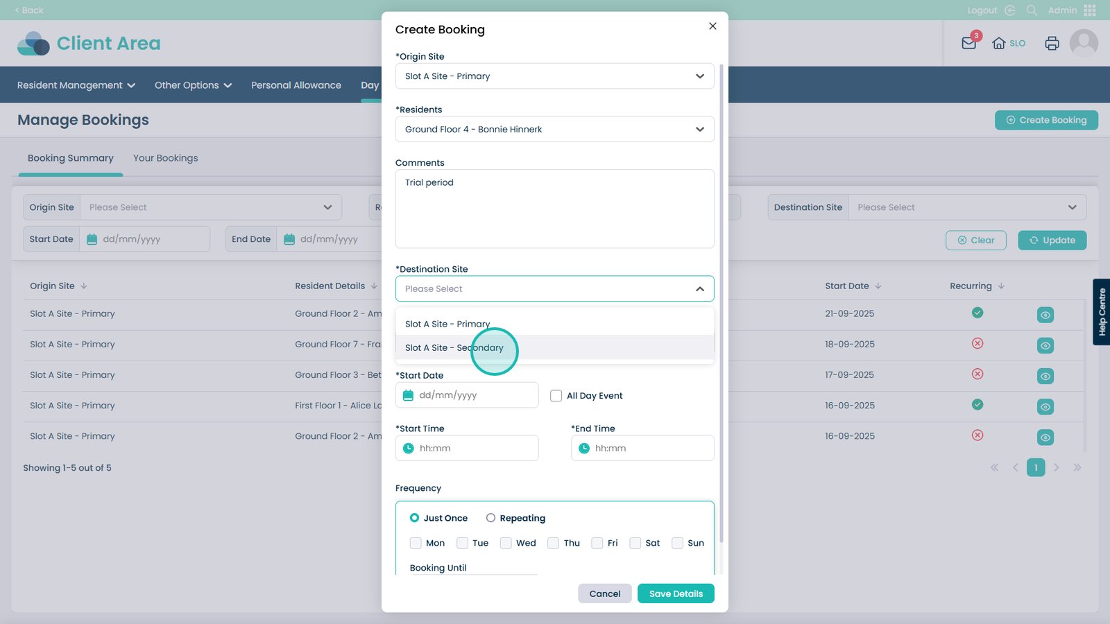 Booking day centre visits has never been easier. This feature allows you to quickly create and manage bookings for your residents, making sure everyone is where they need to be at the right time. You can select the starting and destination sites, choose the resident, set times and dates, and even make recurring bookings for regular visits. Adding notes and assigning CSGs helps keep staff informed and ensures residents receive the right care and support.