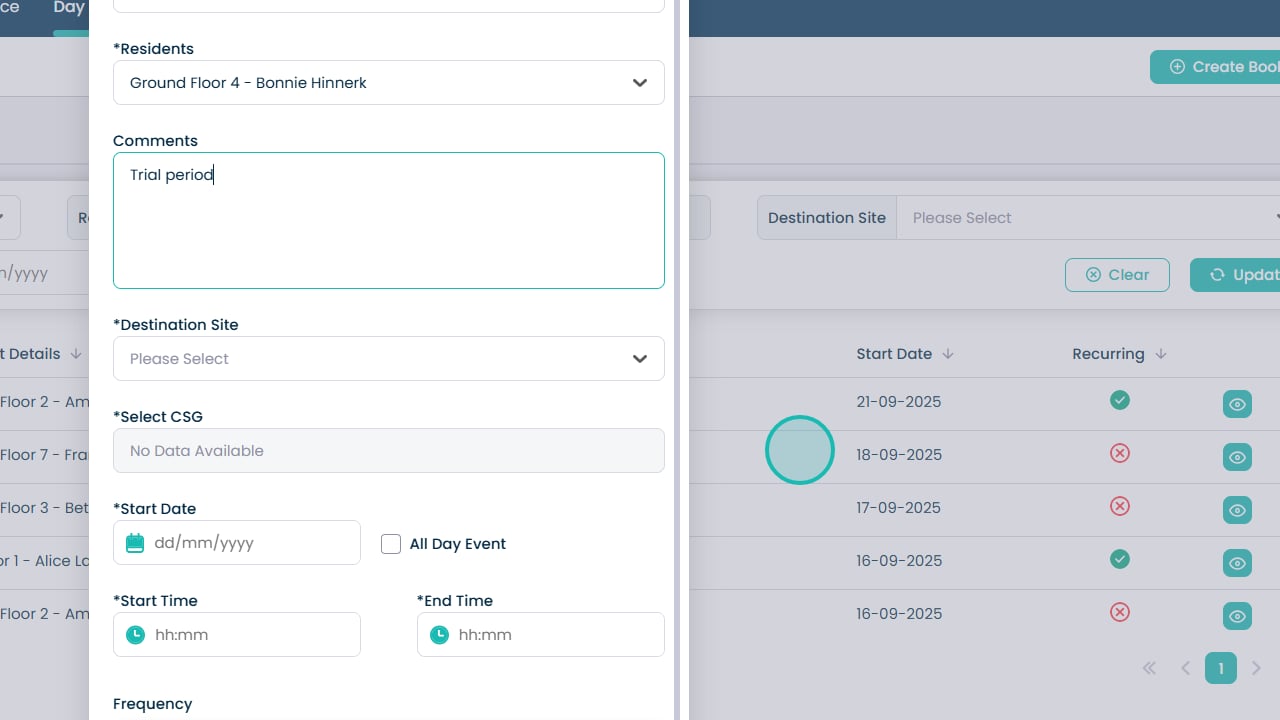 Booking day centre visits has never been easier. This feature allows you to quickly create and manage bookings for your residents, making sure everyone is where they need to be at the right time. You can select the starting and destination sites, choose the resident, set times and dates, and even make recurring bookings for regular visits. Adding notes and assigning CSGs helps keep staff informed and ensures residents receive the right care and support.