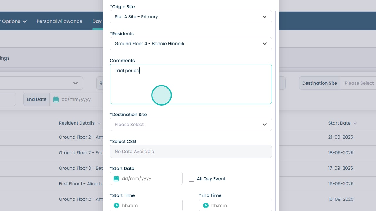 Booking day centre visits has never been easier. This feature allows you to quickly create and manage bookings for your residents, making sure everyone is where they need to be at the right time. You can select the starting and destination sites, choose the resident, set times and dates, and even make recurring bookings for regular visits. Adding notes and assigning CSGs helps keep staff informed and ensures residents receive the right care and support.
