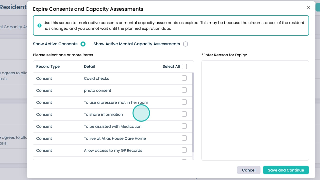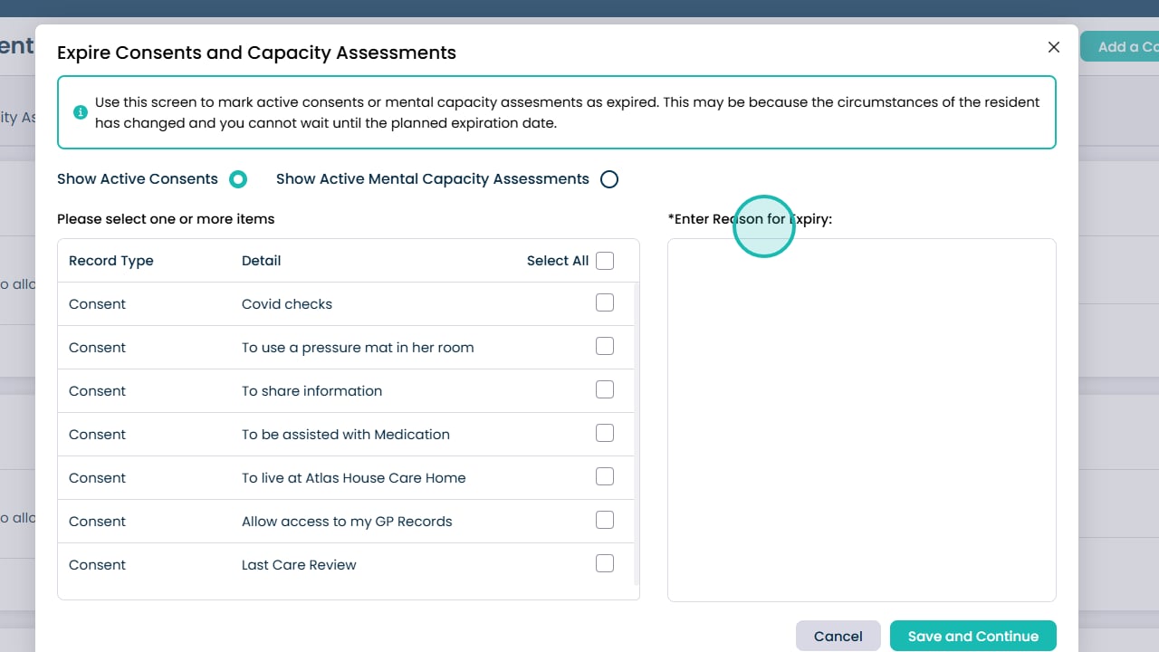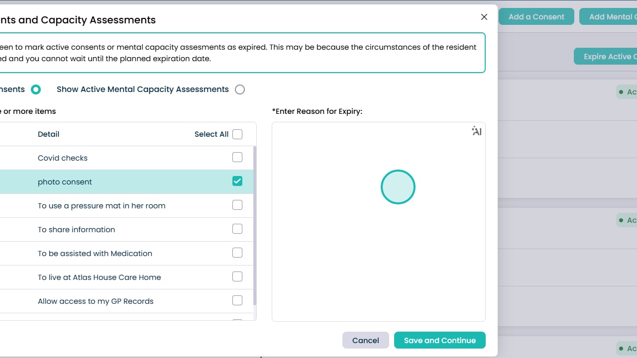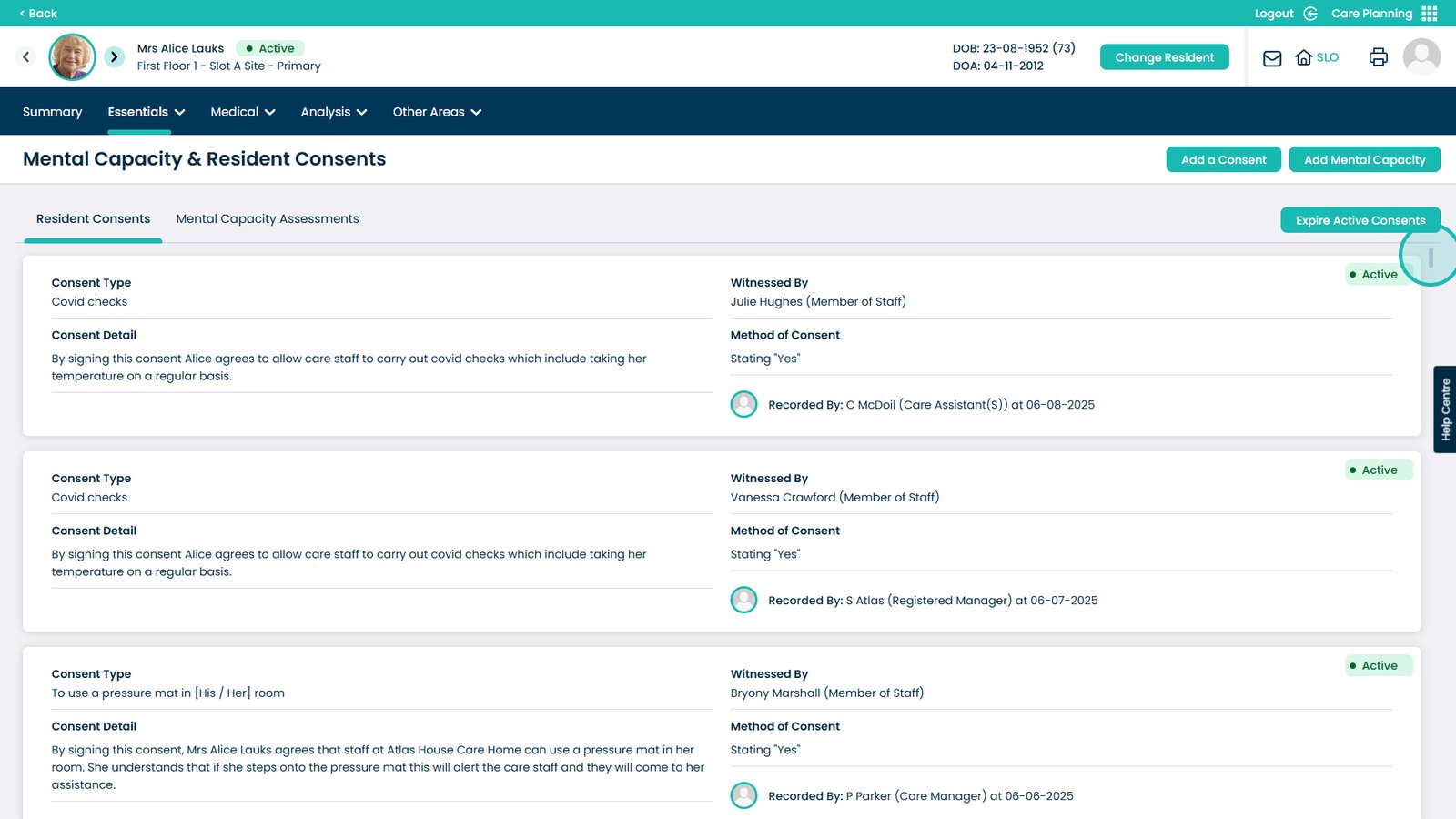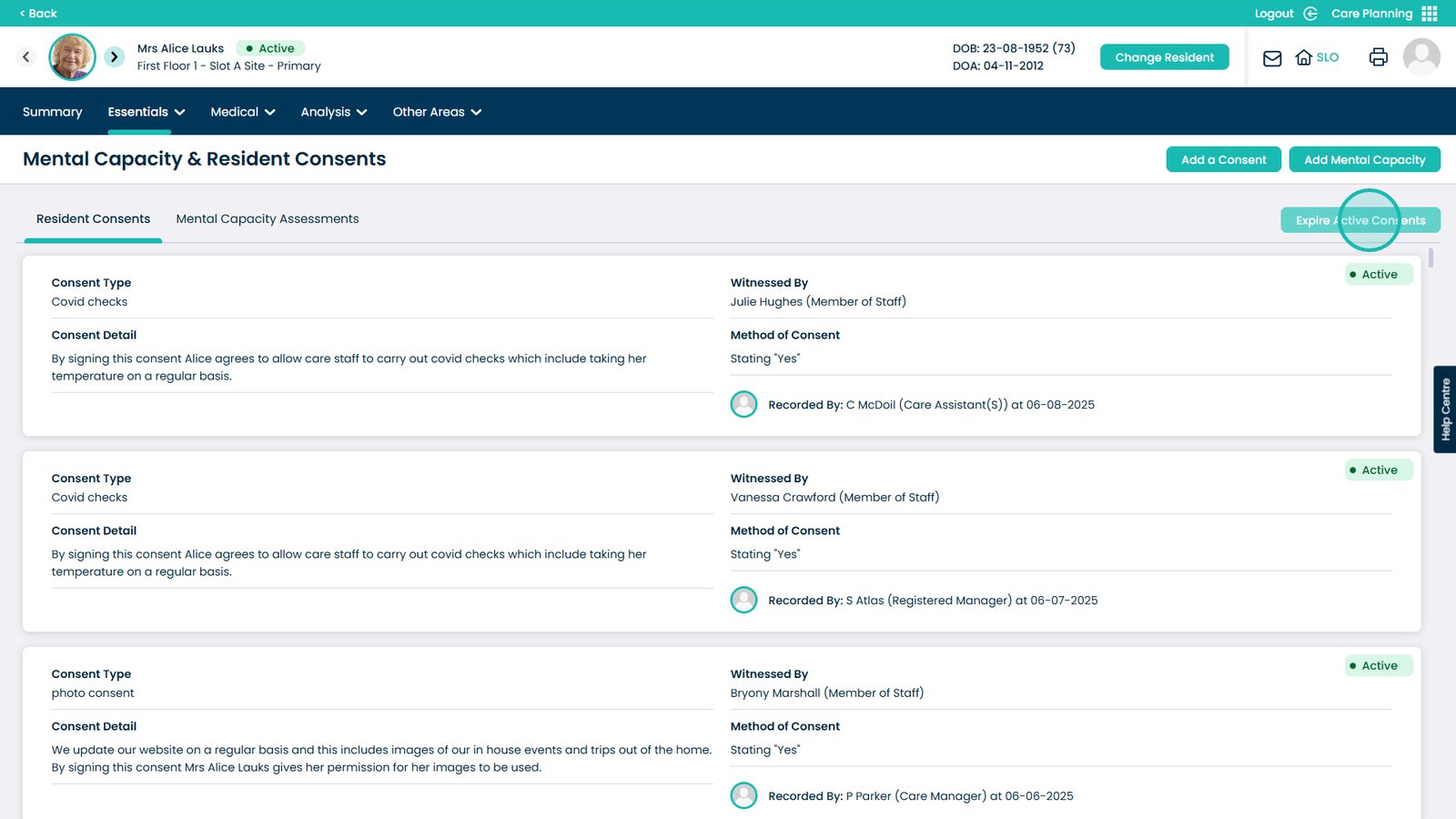 Expiring a mental capacity assessment and consents ensures that care staff always work with up-to-date information about the individual’s ability to make decisions and the permissions in place for their care. A person’s capacity can change over time due to illness, medication, or recovery, so setting an expiry date prompts a timely review rather than relying on outdated records. This supports safer, person-centred care and helps staff make decisions that reflect the individual’s current situation.