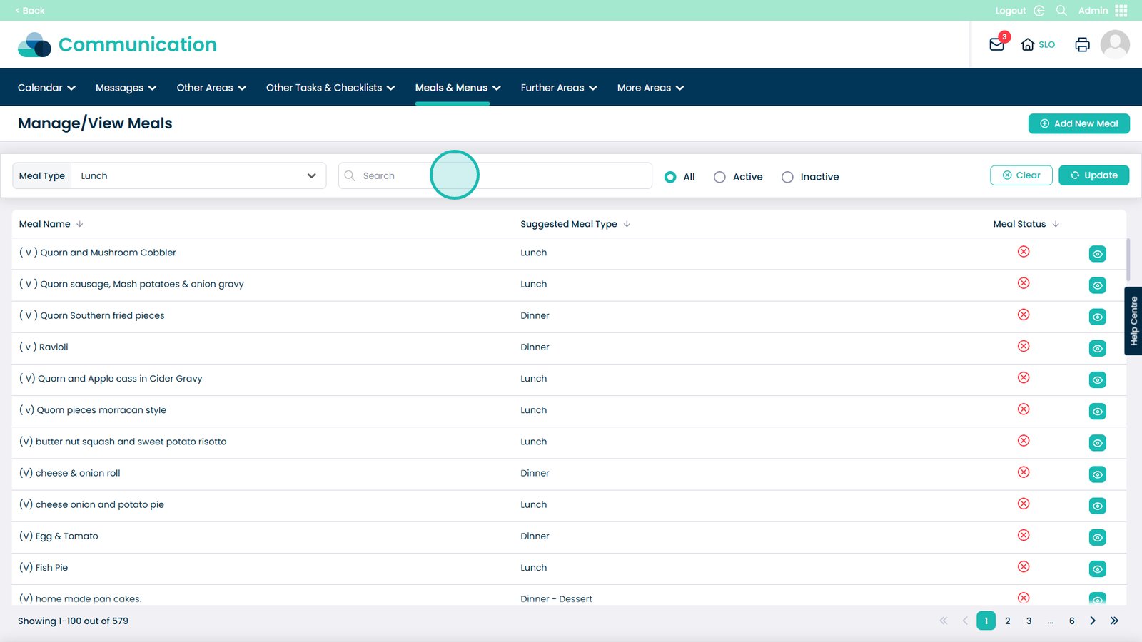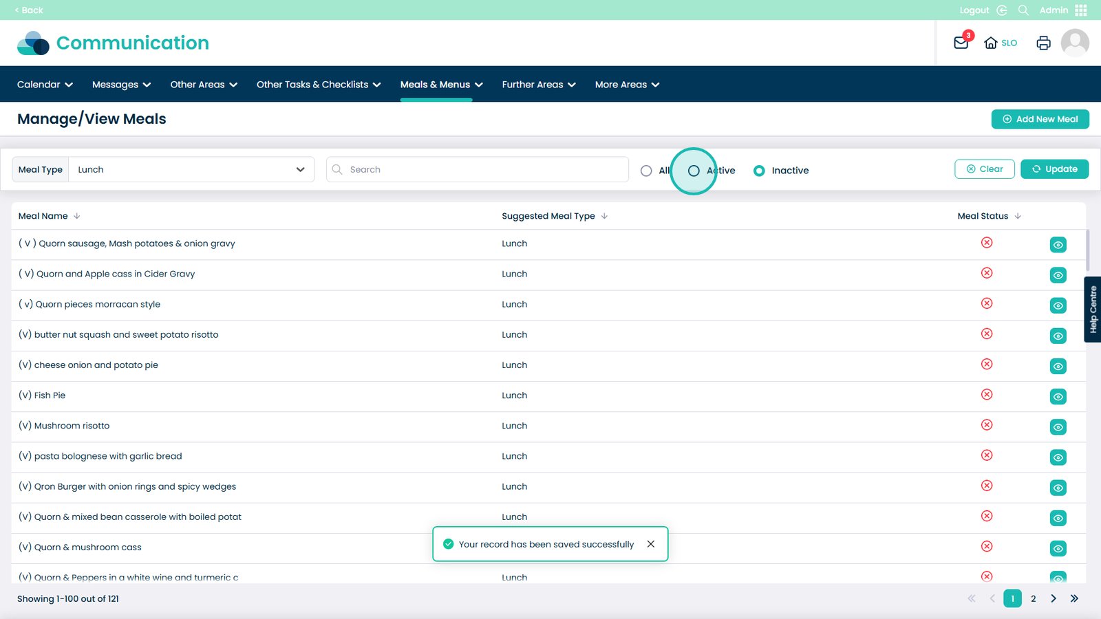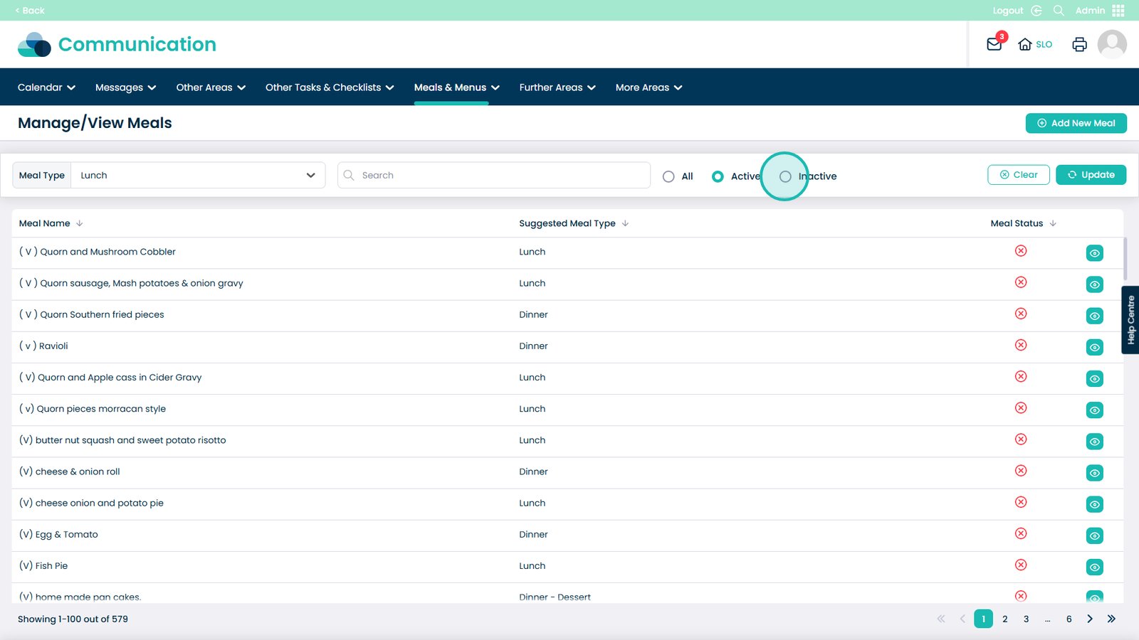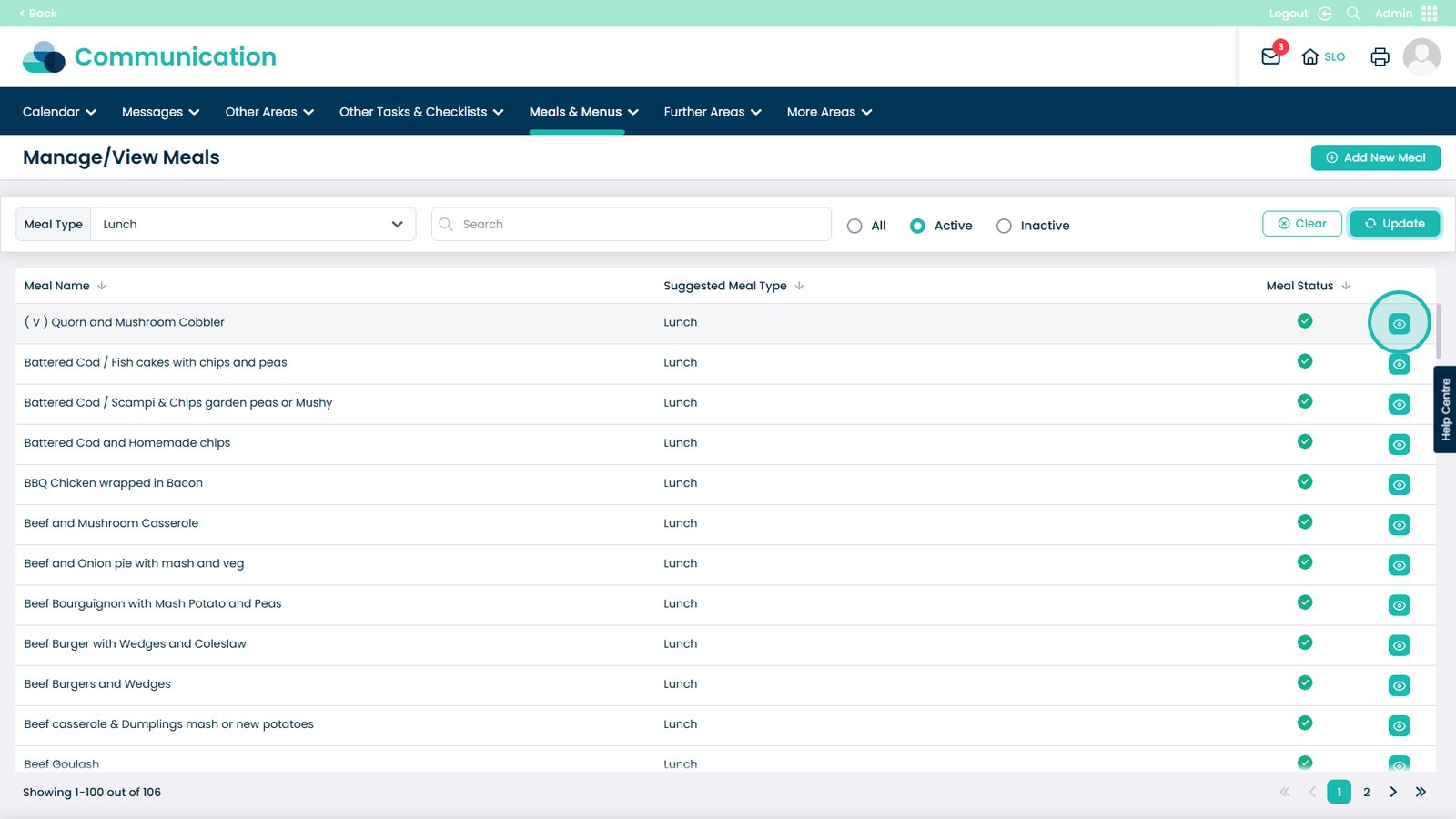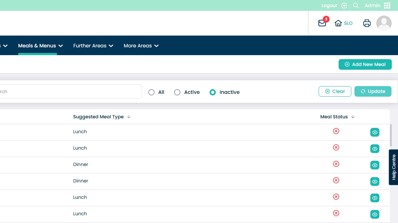Keeping your meal information accurate and up to date is essential for providing a smooth dining experience for residents and staff. This feature makes it easy to view all of your meals in one place, filter them by type, and quickly switch between active and inactive options. You can search for specific meals, reactivate dishes when they’re needed again, and make updates to meal details whenever your menu changes.