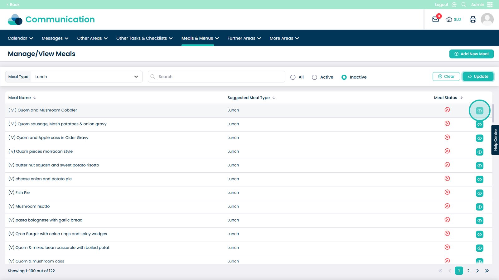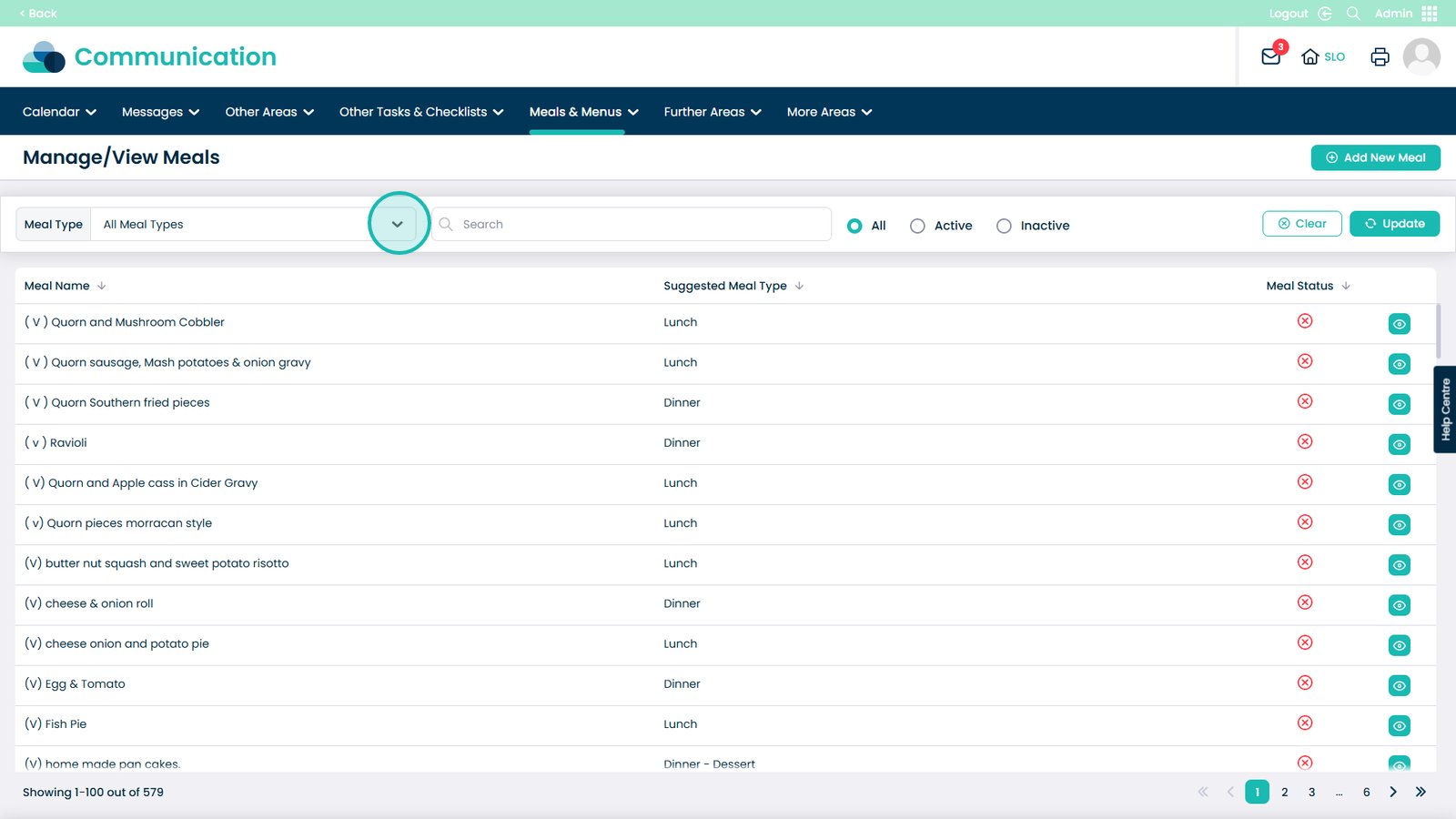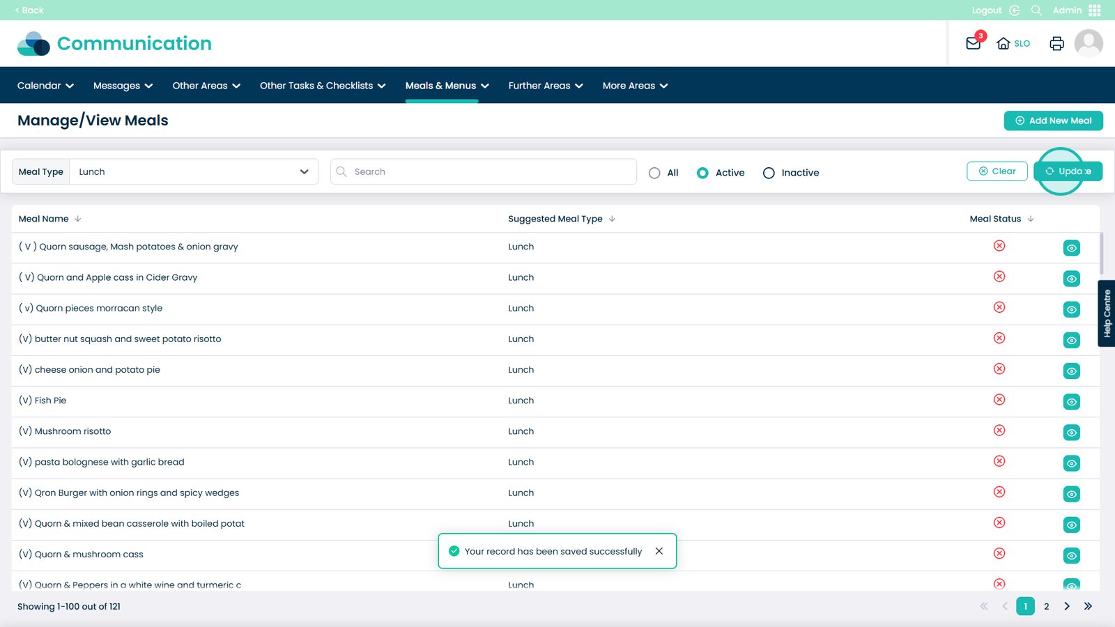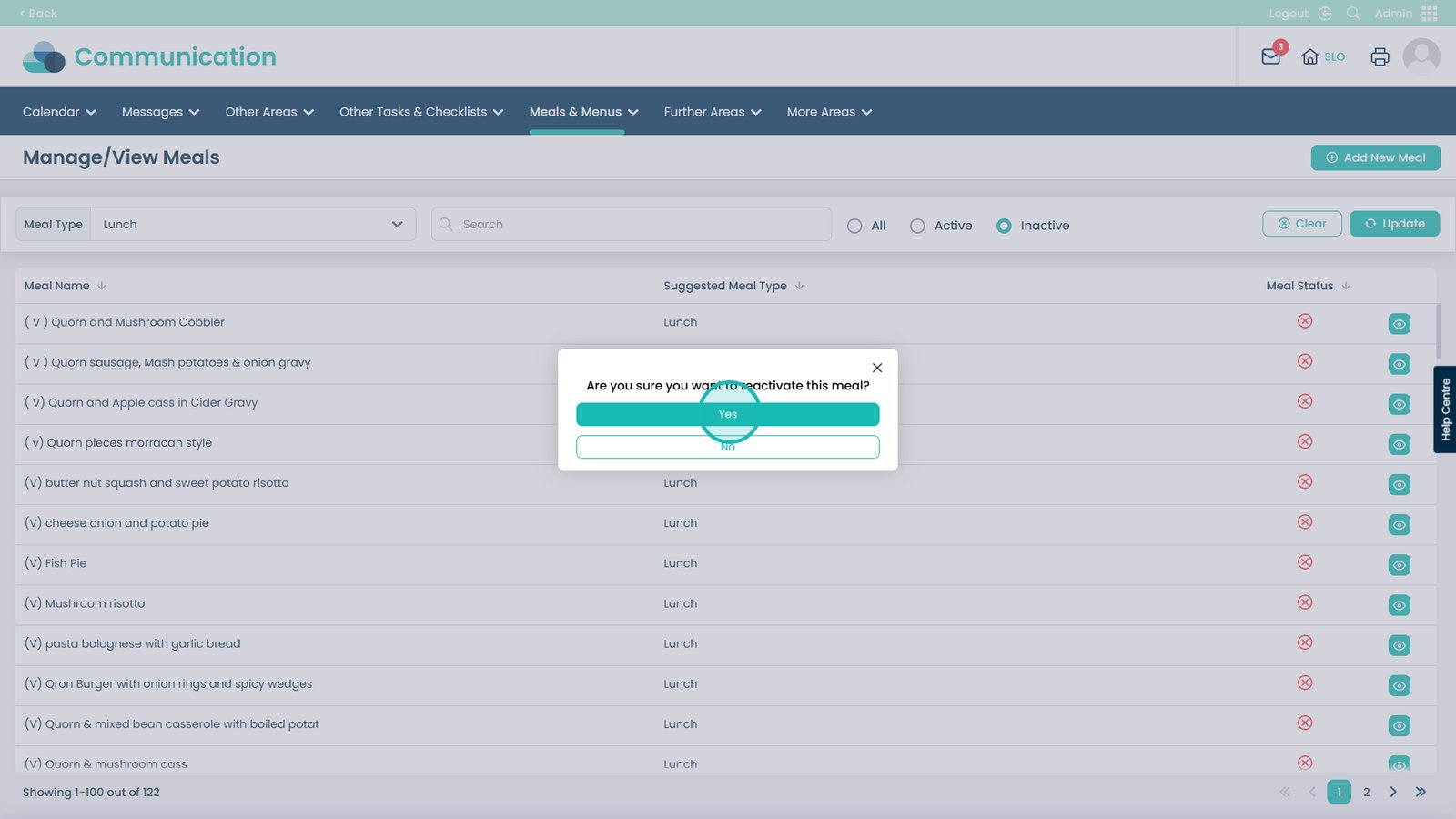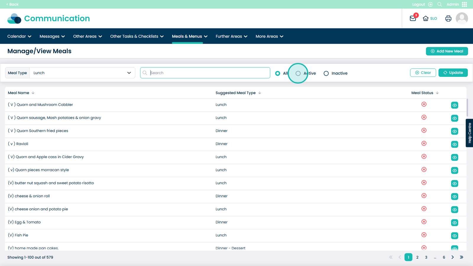 Keeping your meal information accurate and up to date is essential for providing a smooth dining experience for residents and staff. This feature makes it easy to view all of your meals in one place, filter them by type, and quickly switch between active and inactive options. You can search for specific meals, reactivate dishes when they’re needed again, and make updates to meal details whenever your menu changes.