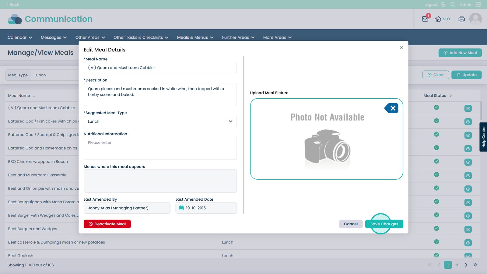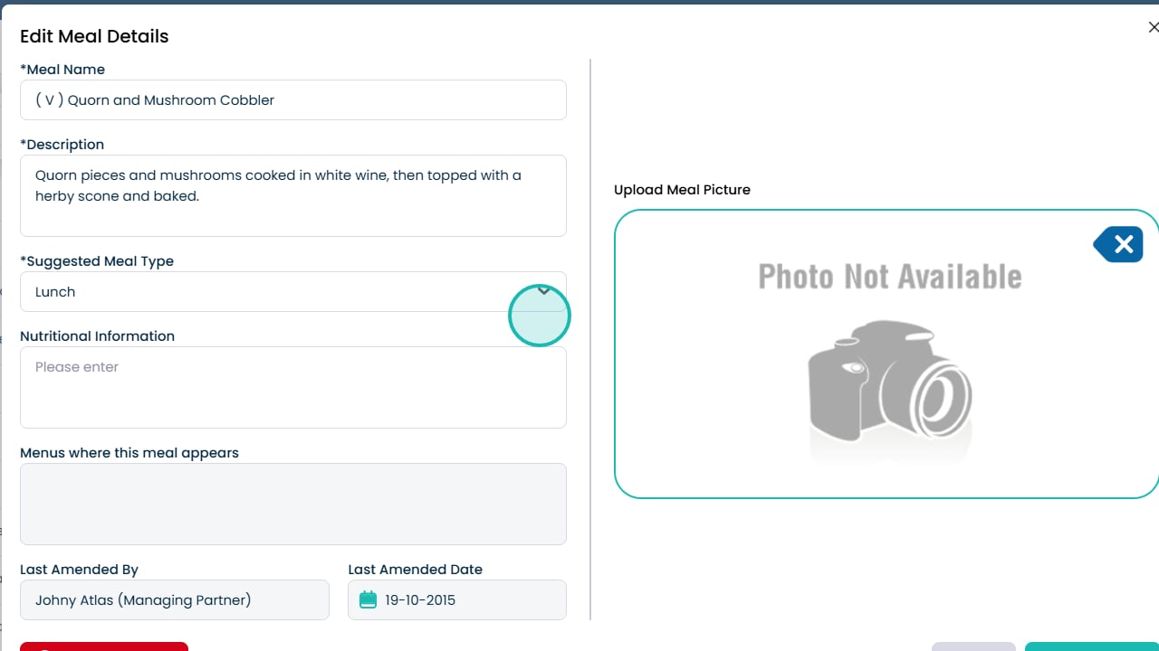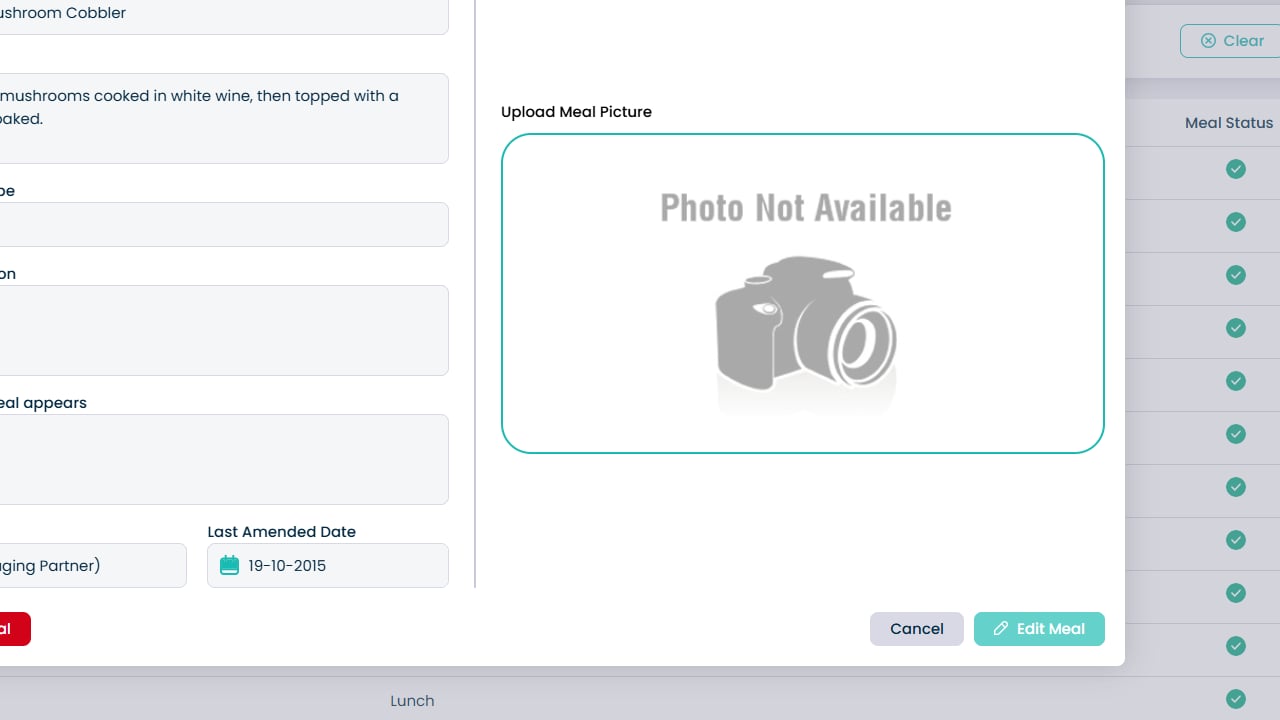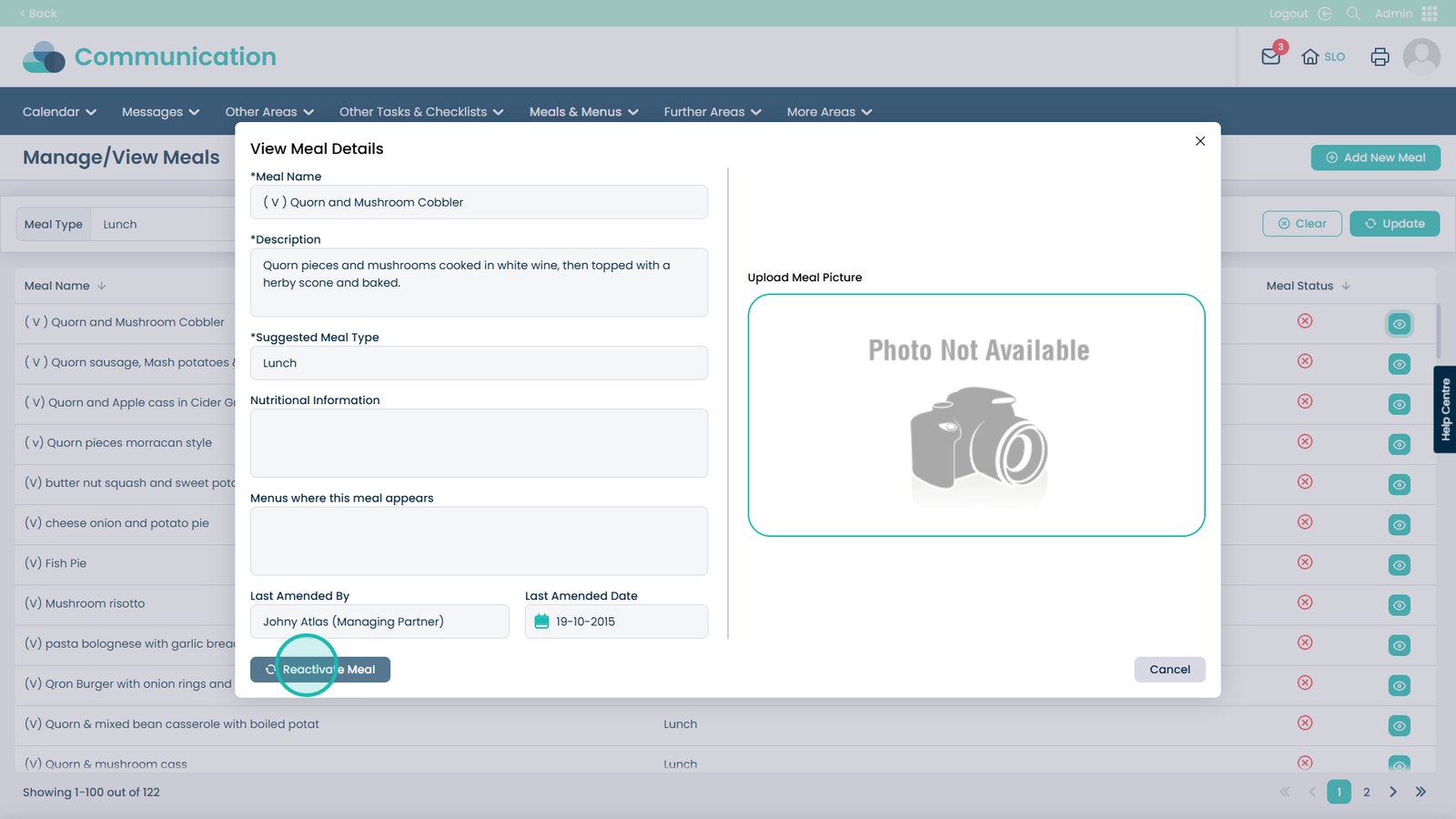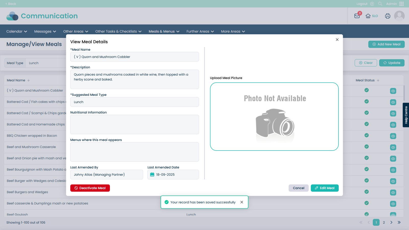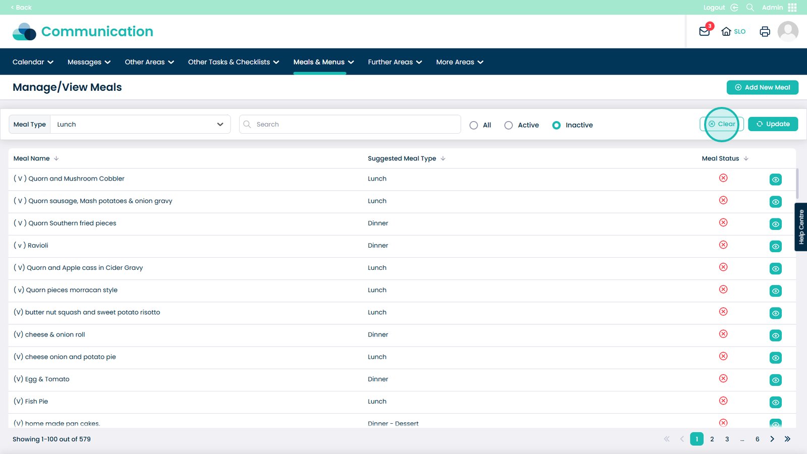 Keeping your meal information accurate and up to date is essential for providing a smooth dining experience for residents and staff. This feature makes it easy to view all of your meals in one place, filter them by type, and quickly switch between active and inactive options. You can search for specific meals, reactivate dishes when they’re needed again, and make updates to meal details whenever your menu changes.