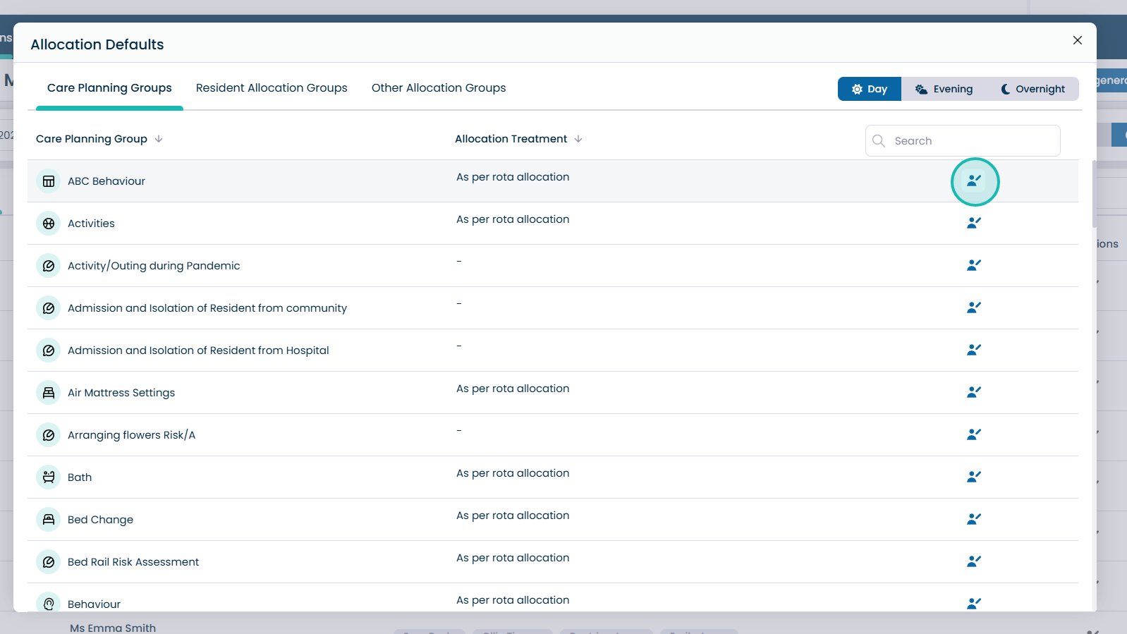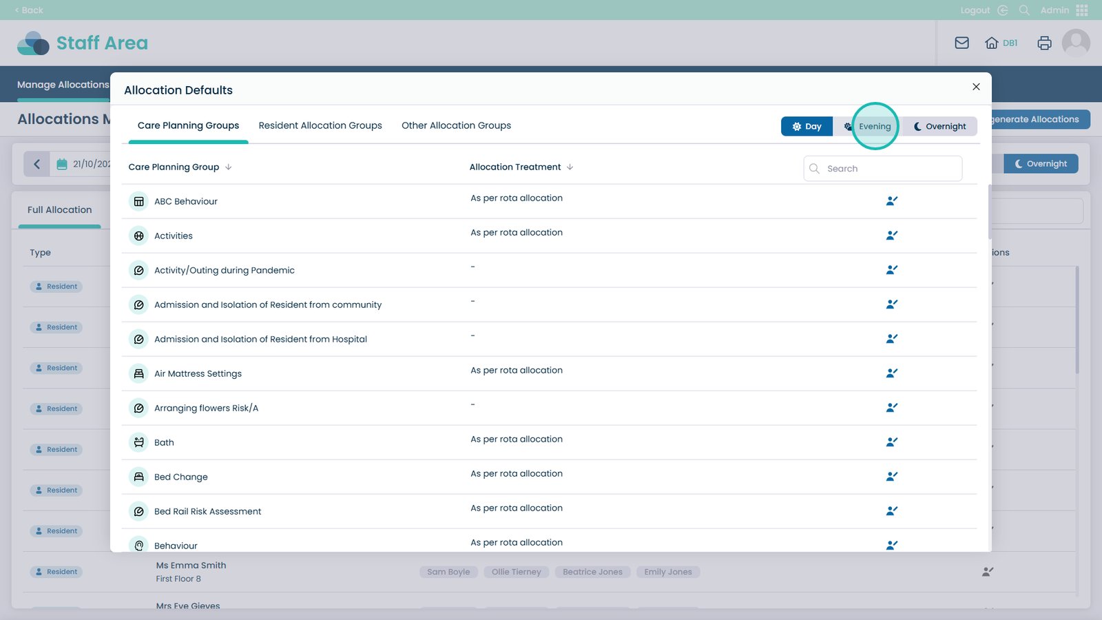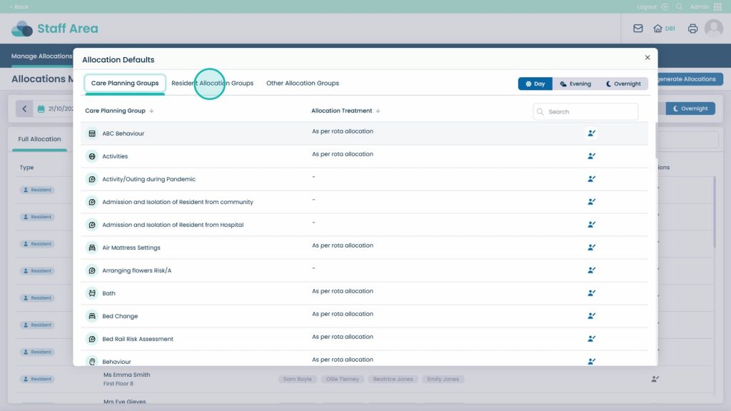 The Allocation Defaults by Staff Category feature enables you to define which staff groups (e.g., carers, nurses, senior care workers) are automatically included in Day, Evening, or Overnight allocations. Setting these defaults helps maintain consistent allocation processes across all shifts and groups while reducing manual workload.