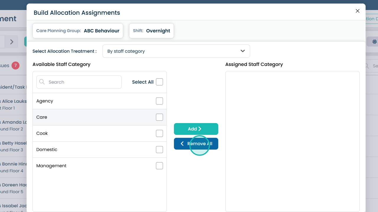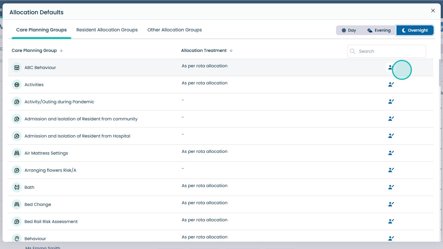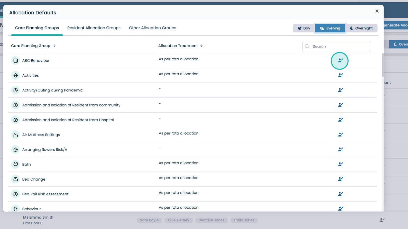 The Allocation Defaults by Staff Category feature enables you to define which staff groups (e.g., carers, nurses, senior care workers) are automatically included in Day, Evening, or Overnight allocations. Setting these defaults helps maintain consistent allocation processes across all shifts and groups while reducing manual workload.