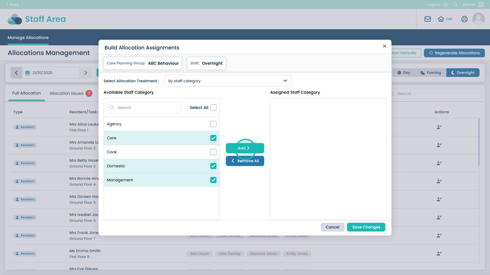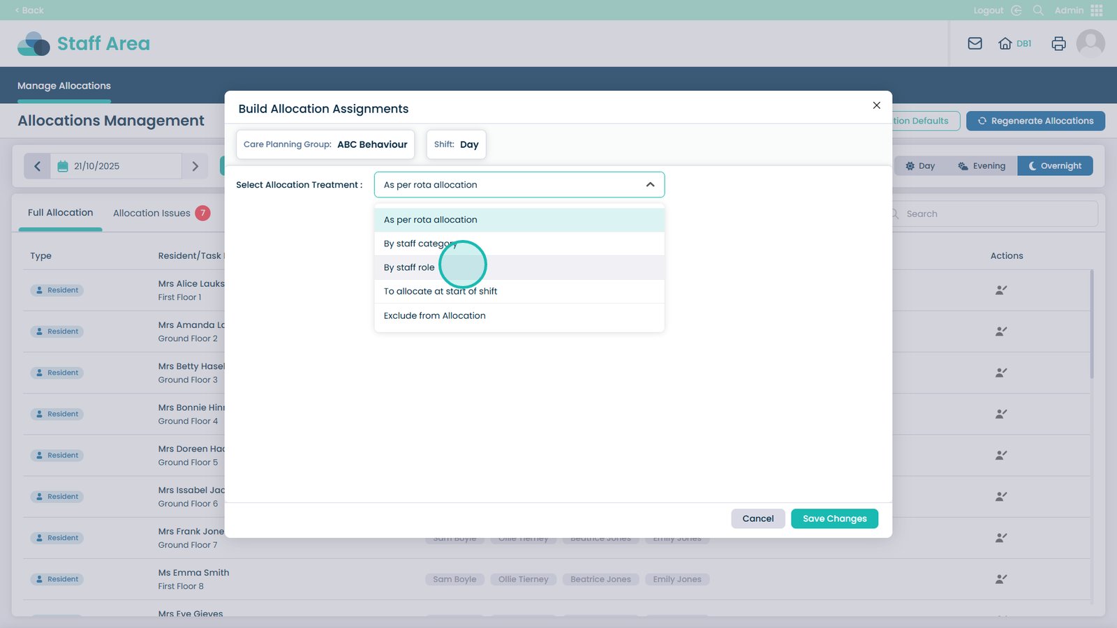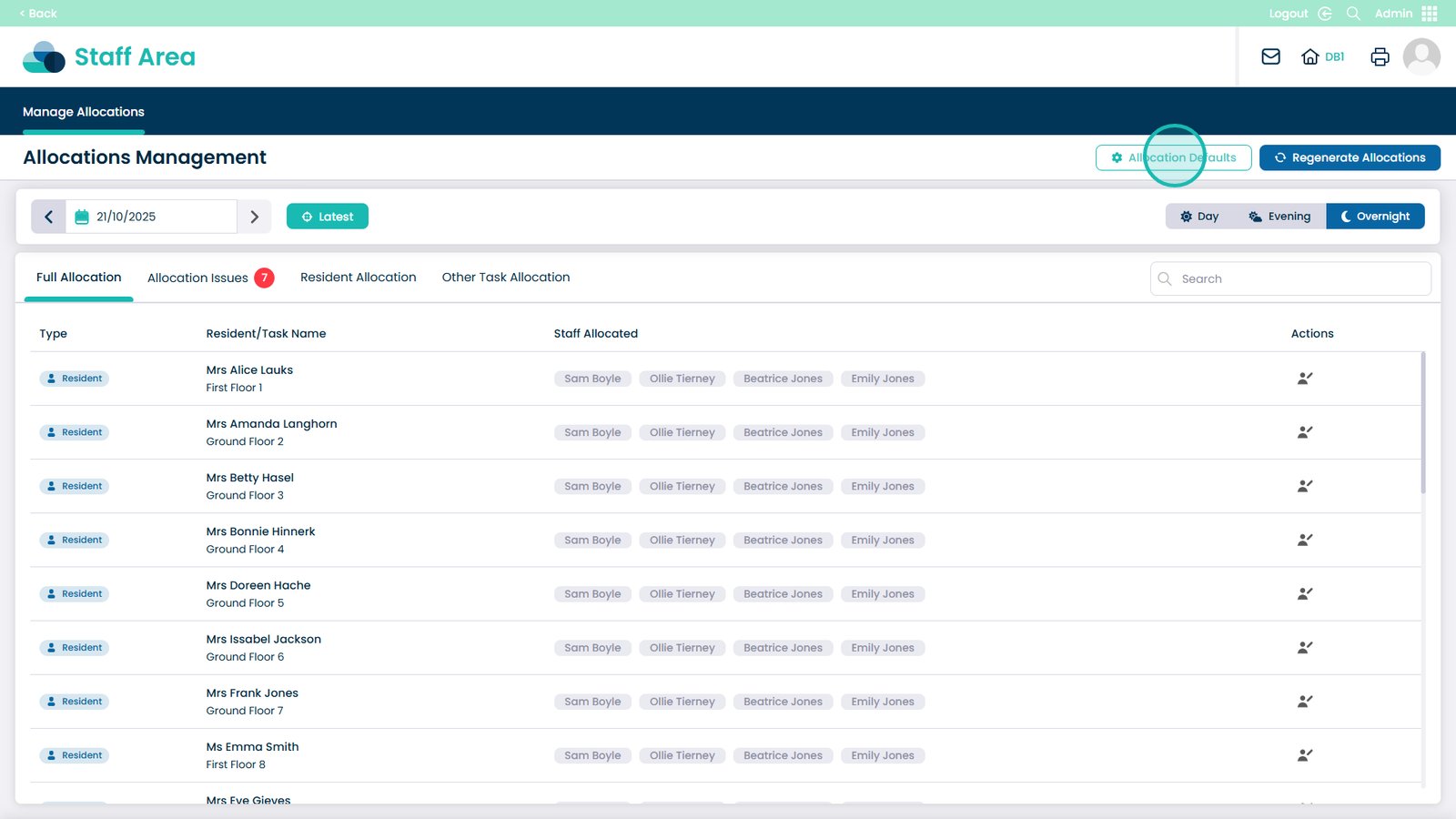 The Manage Allocations area in the Care Control Admin App gives managers and administrators full control over how staff are assigned to service users and care activities across all times of day. This section brings together several key tools — Allocation Issues, Allocation Defaults by Staff Category, and Allocation Defaults by Staff Role — allowing you to manage, automate, and correct staff allocations efficiently. These features work seamlessly across Care Planning Groups, Resident Allocation Groups, and Other Allocation Groups.