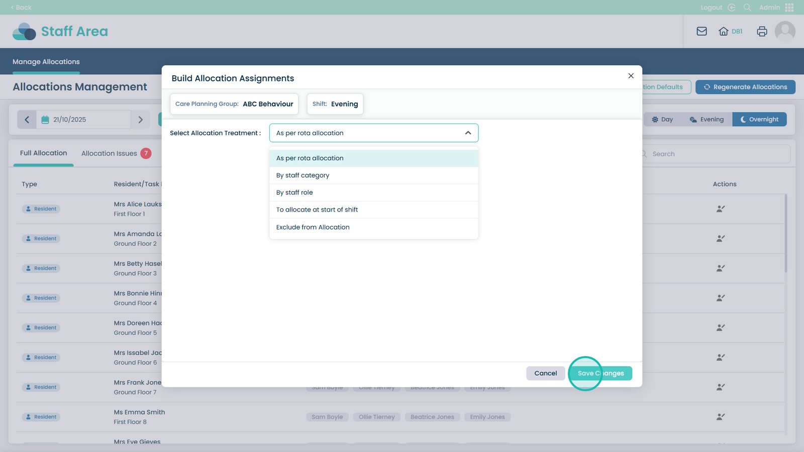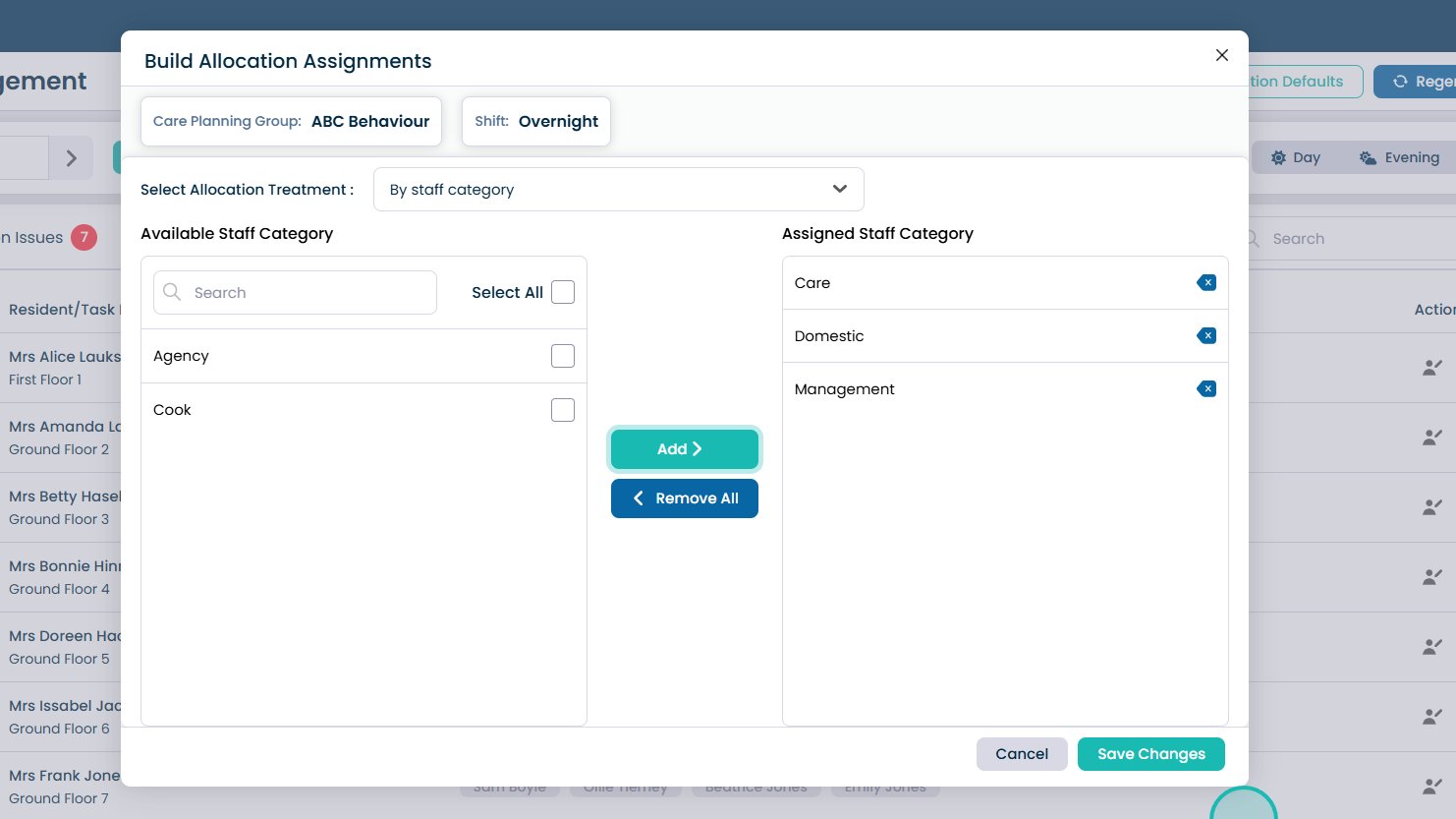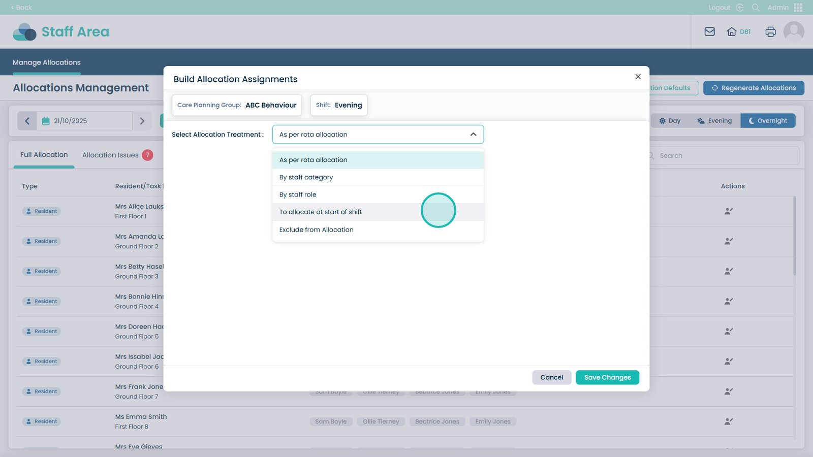 The Manage Allocations area in the Care Control Admin App gives managers and administrators full control over how staff are assigned to service users and care activities across all times of day. This section brings together several key tools — Allocation Issues, Allocation Defaults by Staff Category, and Allocation Defaults by Staff Role — allowing you to manage, automate, and correct staff allocations efficiently. These features work seamlessly across Care Planning Groups, Resident Allocation Groups, and Other Allocation Groups.